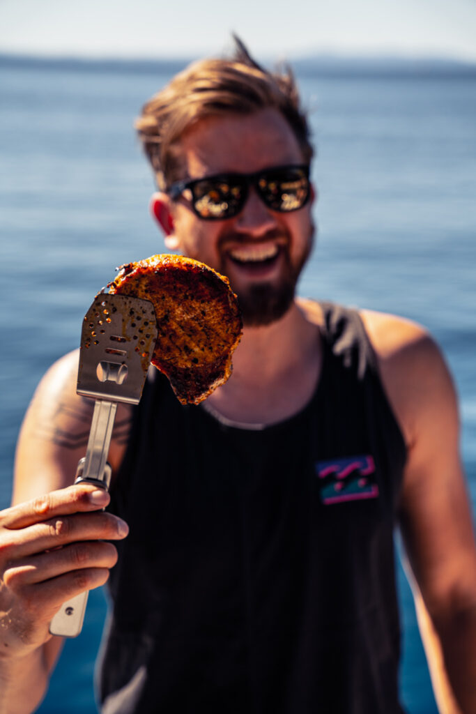 Nach meinem ersten Segeltrip durch die Adria kann ich deshalb nicht ganz ohne Stolz verkünden, dass das Verköstigen von 8 Männern auf freier See zumindest eines mit Camping gemeinsam hat: den ständigen Kampf ums Überleben. Und den habe ich dank des gleichsam kompakten wie kraftvollen “Jones”-Grills von Burnhard mit Bravour gemeistert. Nimm das, Bear Grills!