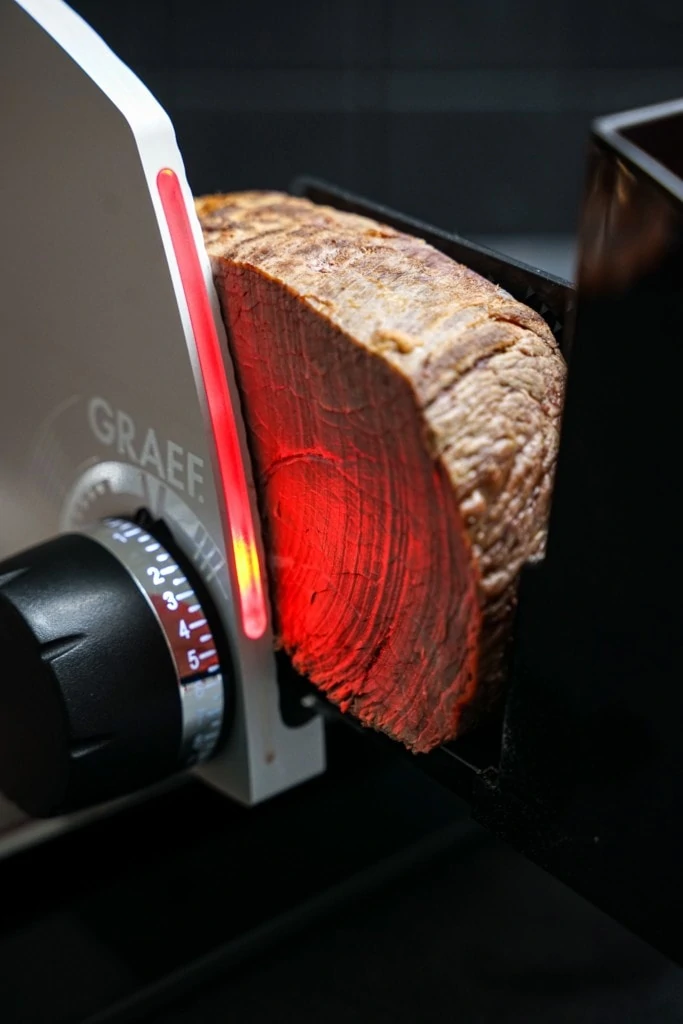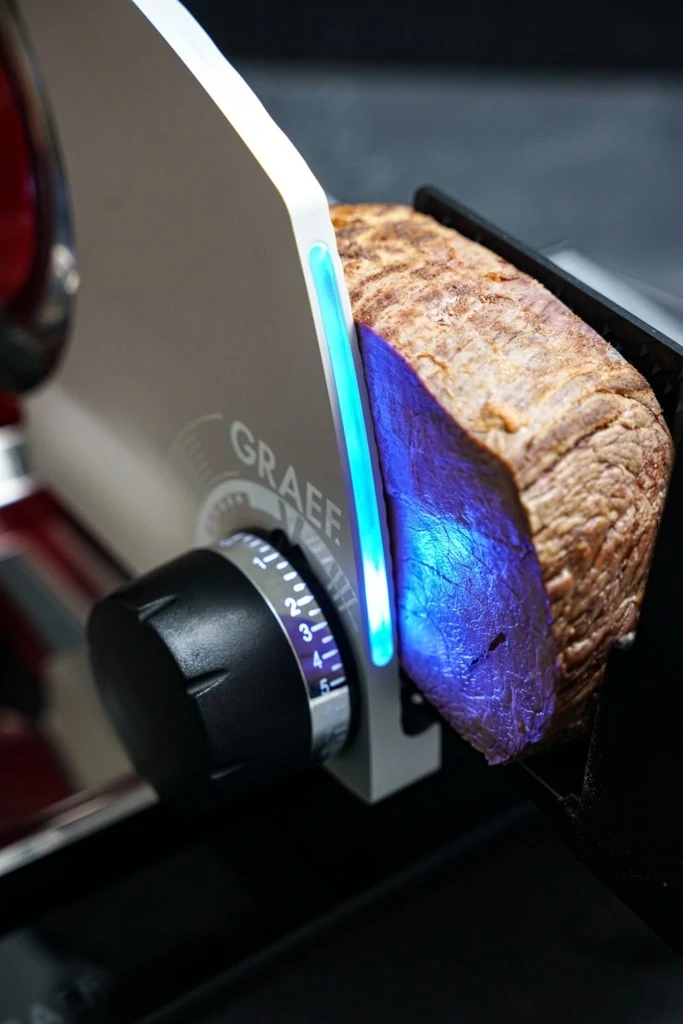 In dieser Maschine stecken 100 Jahre geballte Erfahrung, und das merkt man auch. Das massive Gerät ist hochwertig verarbeitet. Was mir, als Technikfan besonders gut gefällt, ist das freilaufende Messer mit einem abgestimmten Beleuchtungskonzept, das für mehr Sicherheit sorgen soll.