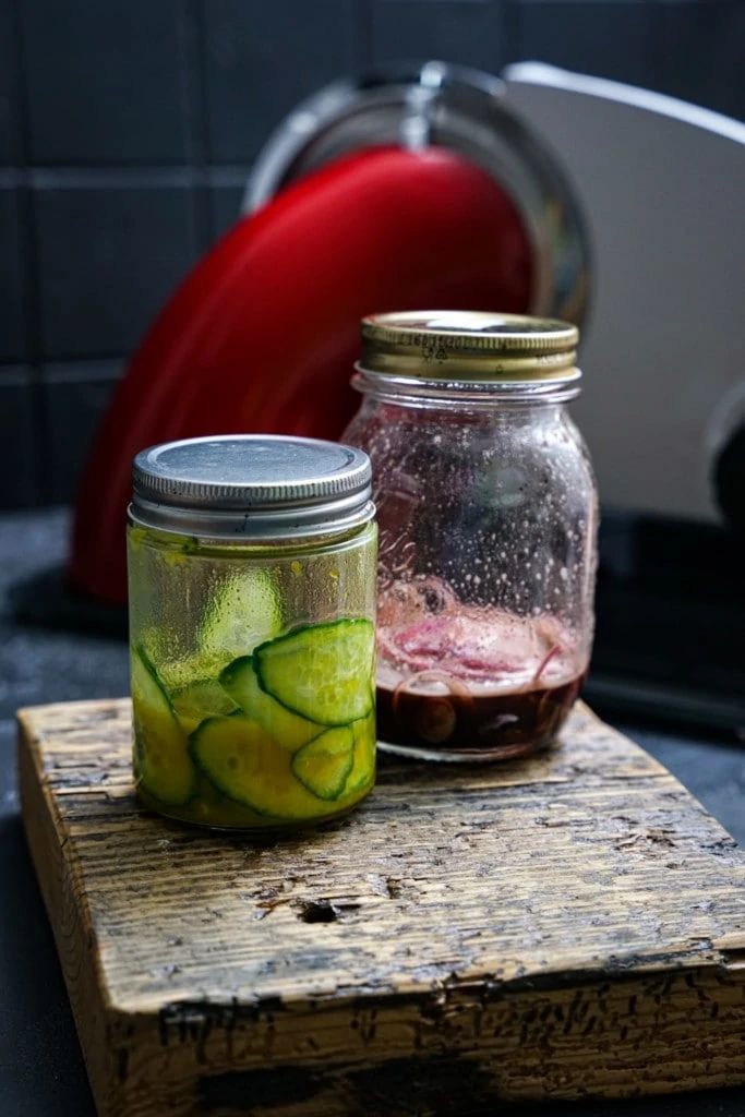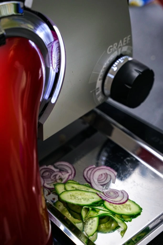 …geht für mich mit dem Feinschneider in Erfüllug. Für meinen Roastbeef-Burger brauche ich fein geschnittenes Fleisch und dazu noch hauchdünne Zwiebel-Ringe und Gurkenscheiben. Wenn Zwiebeln und Gurken so dünn geschnitten sind, kann man sie besonders gut marinieren. Du kannst also eingelegte „High Speed“ Gurkerl und Zwiebeln machen.