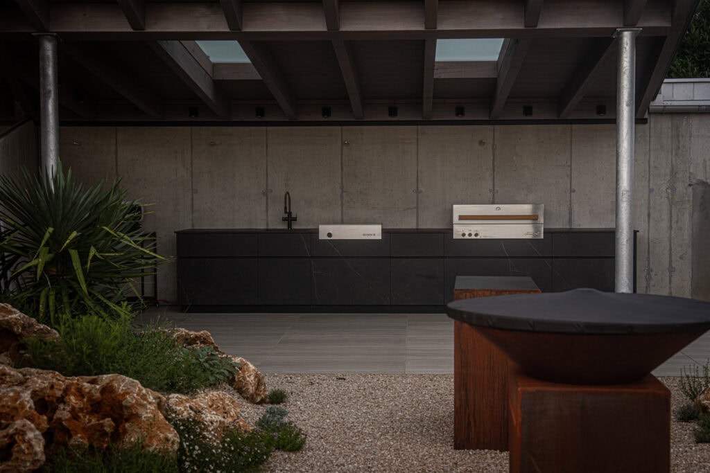 Basis meiner sexy Outdoor-Kitchen bildet das unvergleichbar flexible, modulare System von Grillzimmer, das ich wirklich nur uneingeschränkt weiterempfehlen kann. Keine große Überraschung, schließlich hab ich Michael von Grillzimmer schon auf mehreren BBQ-Events getroffen und war seit jeher großer Fan seiner durchdachten Küchenlösungen. Super-robust, hochwertig verarbeitet und auf intensive Nutzung ausgelegt, lässt sein grandioses Konzept weder funktional noch designtechnisch Wünsche offen. Wertige Edelstahl-Korpusse und praktische Laden fungieren hier als robustes Gerüst, das nach Lust und Laune verkleidet werden kann. In unserem Fall: Dekton von Cosentino. Dieses bietet gegenüber Beton, für den wir uns Indoor entschieden haben, große Vorteile, was Witterung, UV-Strahlung und Dauerbelastung durch intensive Koch- und Grillstunden angeht, sieht aber ebenfalls unverschämt gut aus.