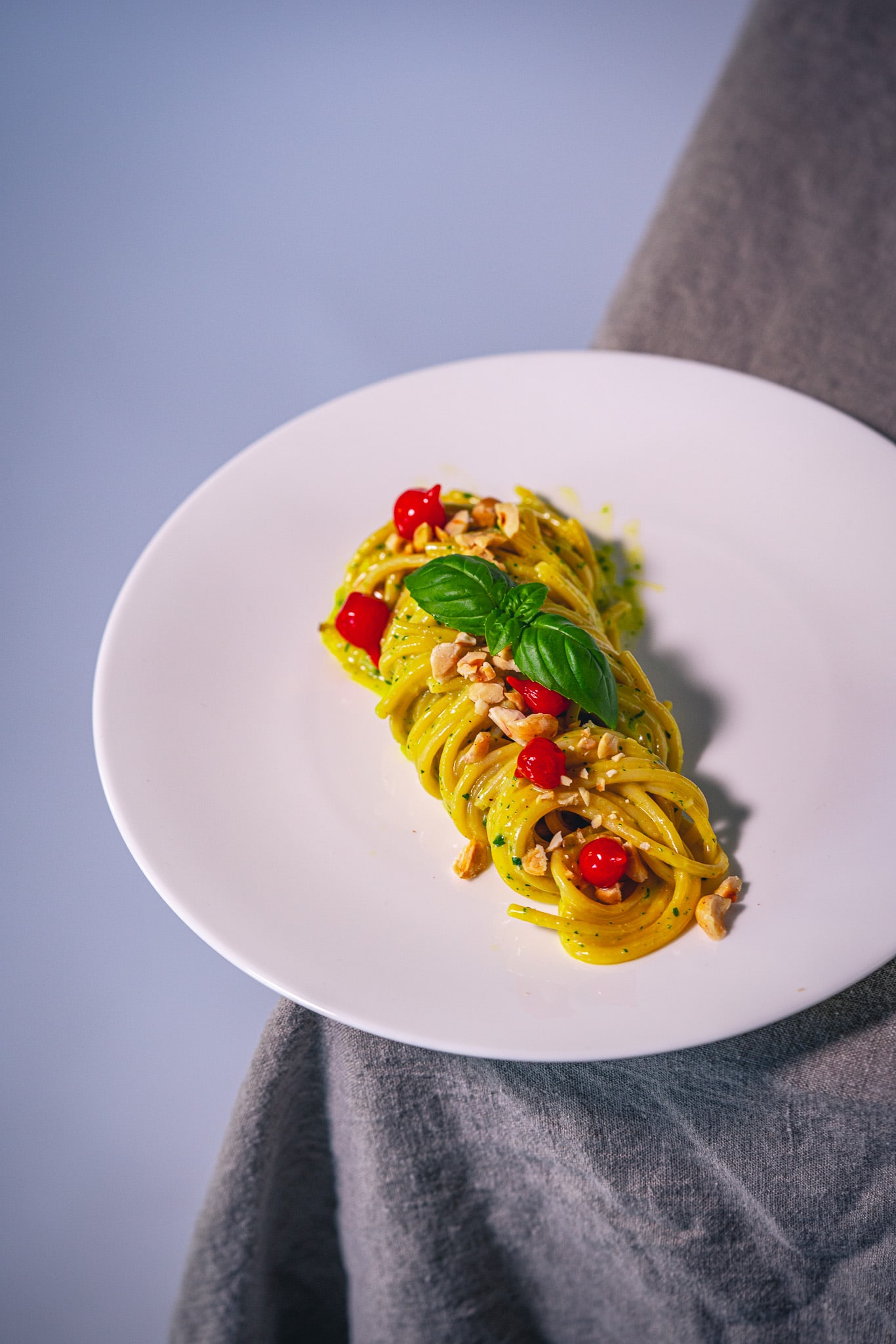 Portioniere die Spaghetti dann auf zwei Tellern und toppe sie mit den gerösteten Haselnüssen, Tropfen-Paprika und frischem Basilikum.