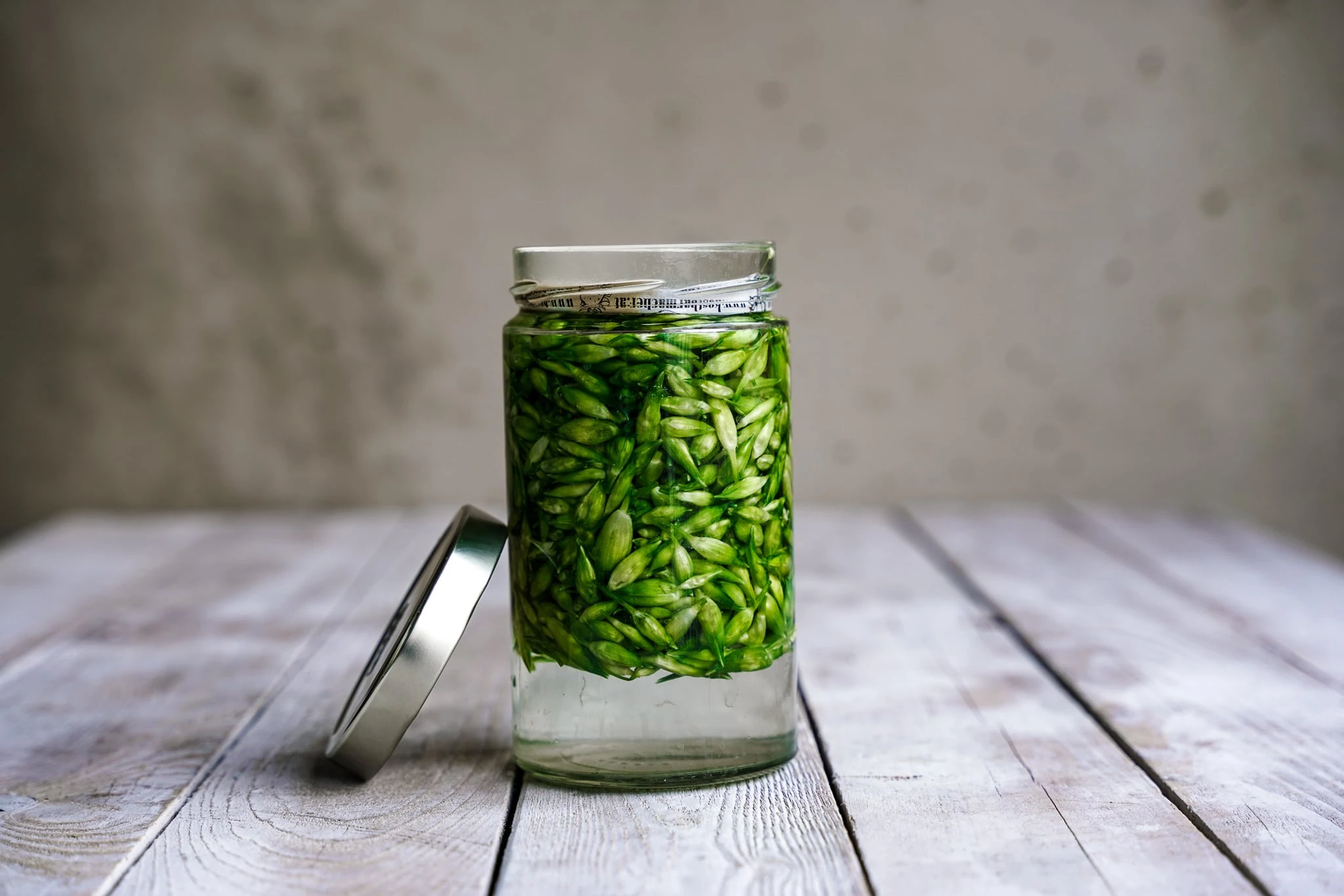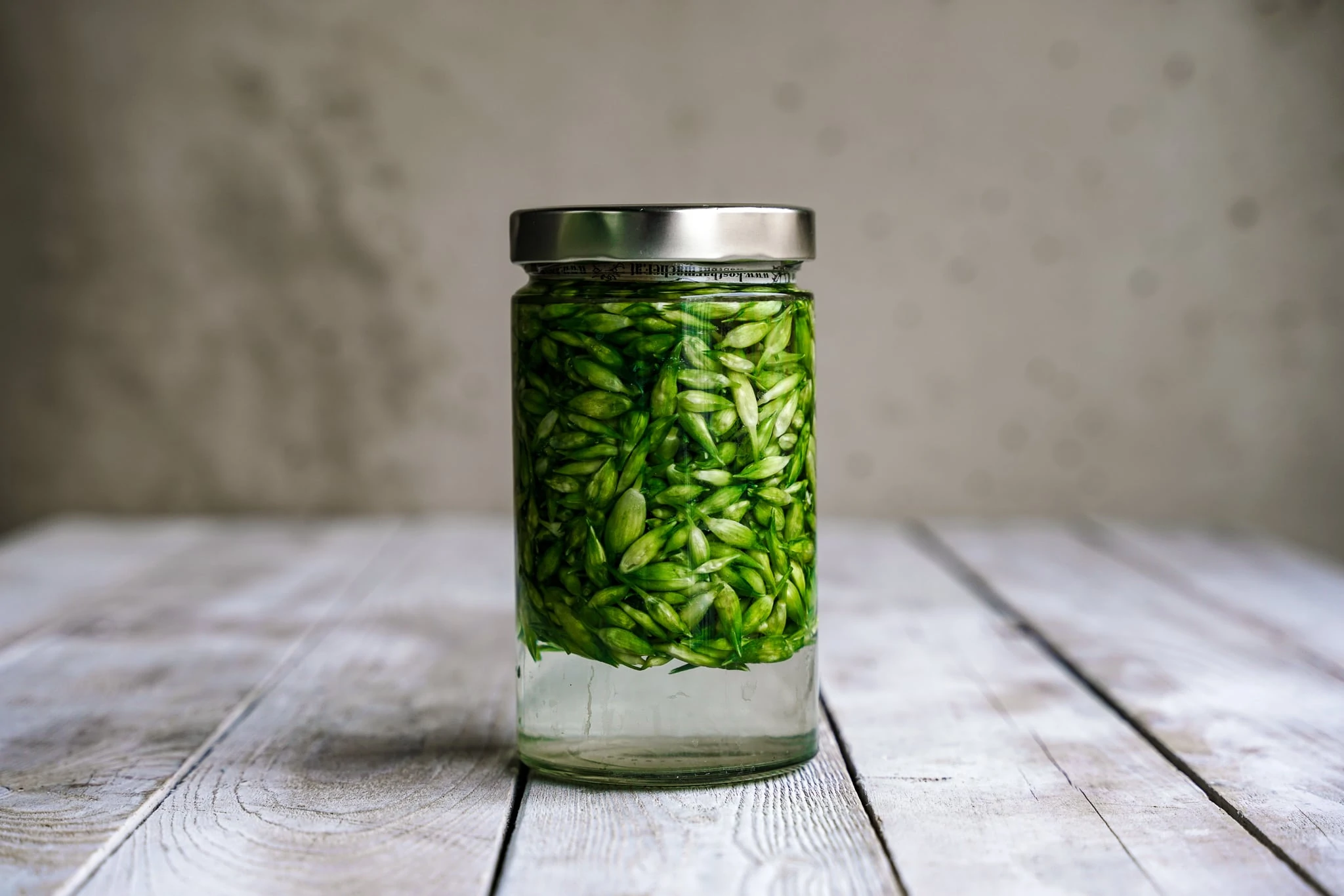 Bärlauchknospen in ein großes Glas geben. Nach dem Befüllen sollten noch ca. 6-8 cm Platz bis zum oberen Rand bleiben.
