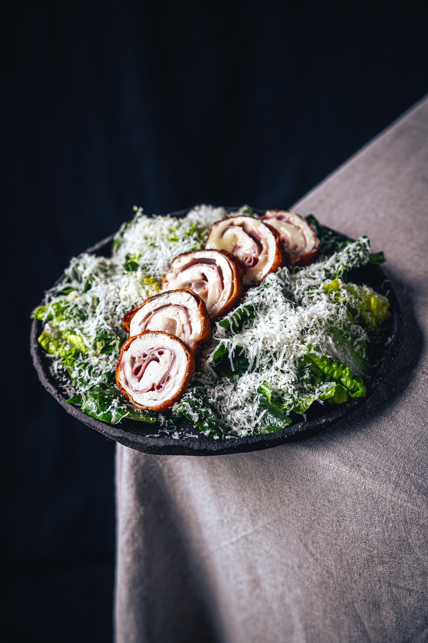 In meiner Variation verwende ich saftiges Hühnerfleisch, das ich mit würzigem Provolone und klassischem Kochschinken fülle. Der Einfachheit halber wird das Fleisch vor dem Panieren aufgerollt, das schaut beim Aufschneiden extra fesch aus! Das Auge isst schließlich mit. Dazu serviere ich knackigen Romanasalat mit frischem Parmesan – und weil so ein g’schmackiges Gericht auch stilvoll begossen werden sollte, steht einem Glaserl gut gekühltem Gösser Biostoff auch nichts im Wege! Also, hau rein und texte mein easy Rezept für Chicken Cordon bleu am besten noch heute. Es zahlt sich aus!