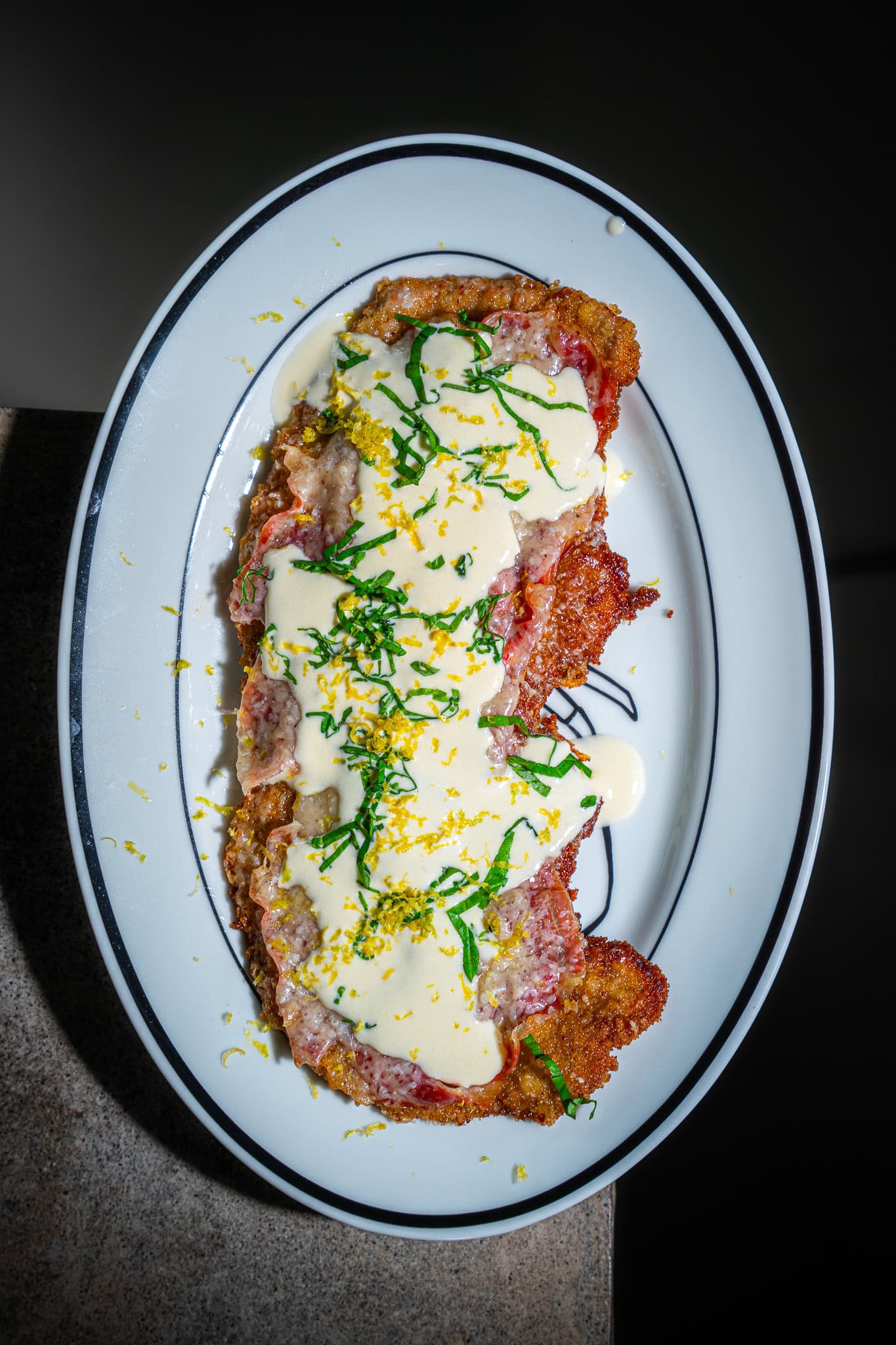 Cotoletta alla Bolognese auf Teller legen, mit 2-3 EL Parmesan-Sauce übergießen und mit Basilikum und Zitronenzesten toppen. Buon appetito & Mahlzeit!