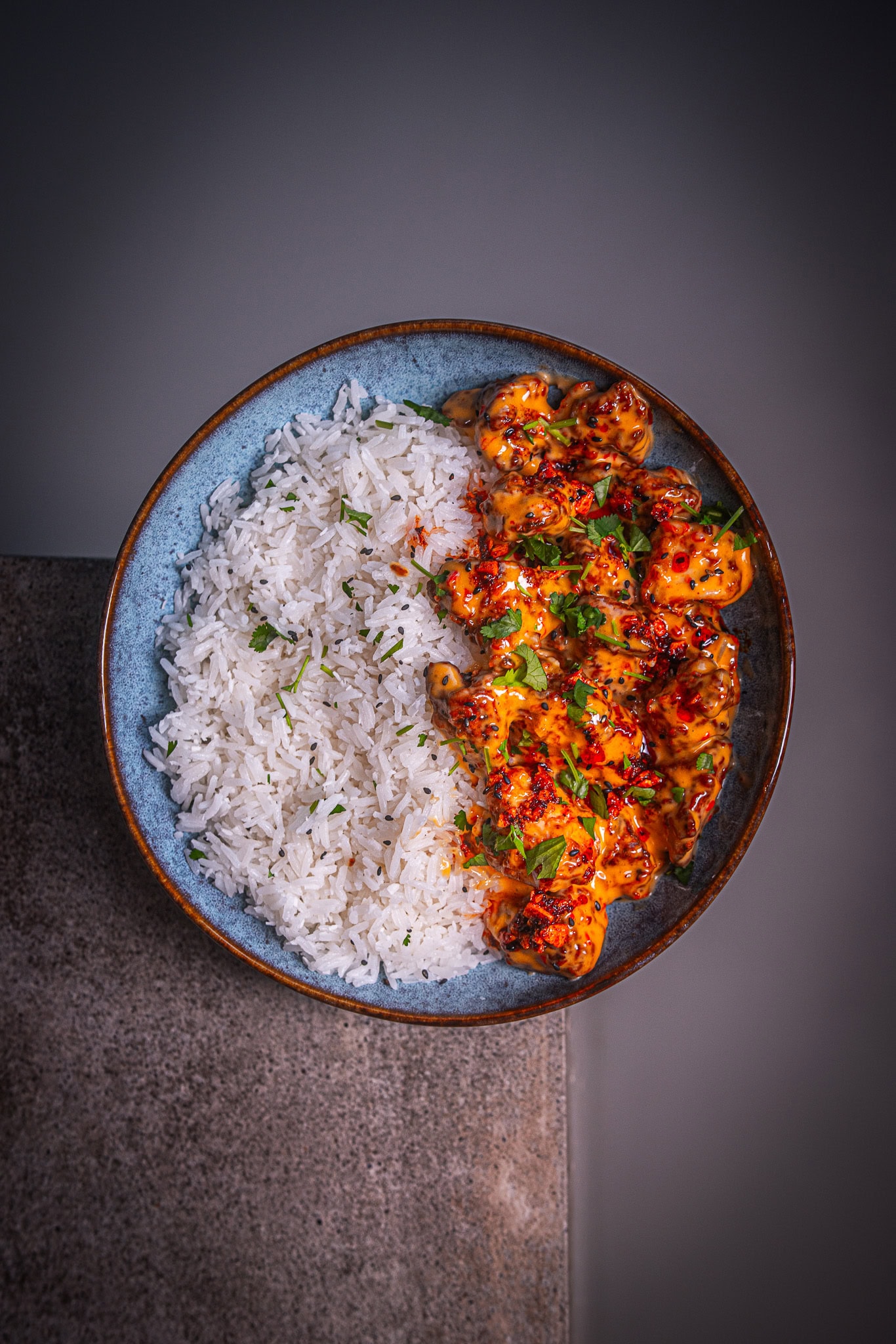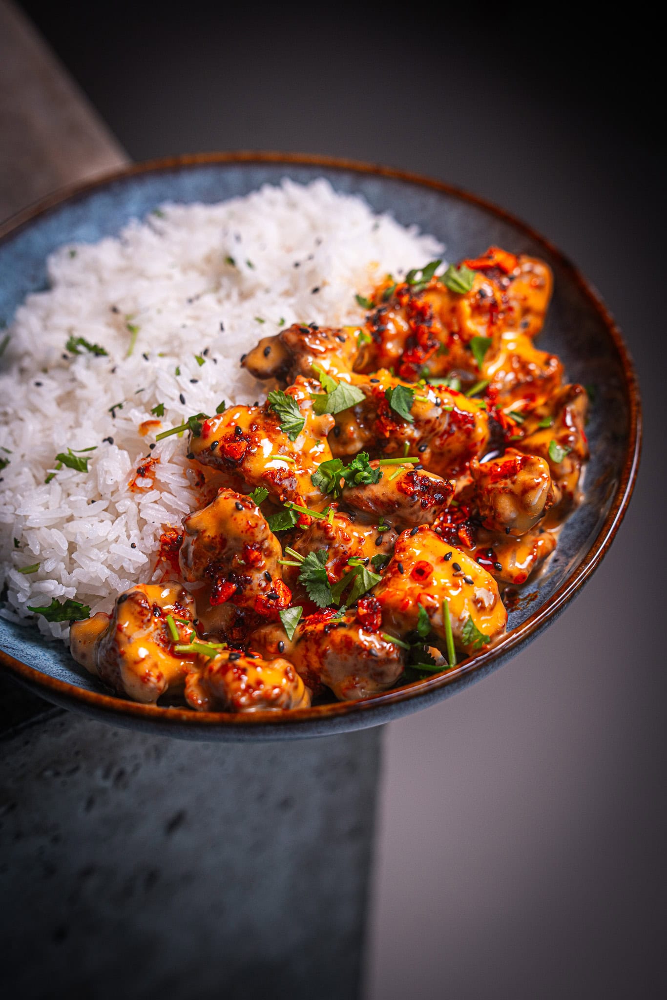Das Hendl zieht in einer Marinade aus Soja, Sake und weiteren aromatischen Zutaten, bevor es letztendlich in Stärke gewendet und knusprig goldbraun frittiert wird. Zusammen mit der cremigen Bang Bang Sauce, die in wenigen Minuten gemixt ist, ergibt es ein köstliches, aber einfaches Gericht, das dich und deine Gäste begeistern wird. Mit Reis und ein paar würzigen Toppings finalisieren – fertig ist das perfekte Dinner!