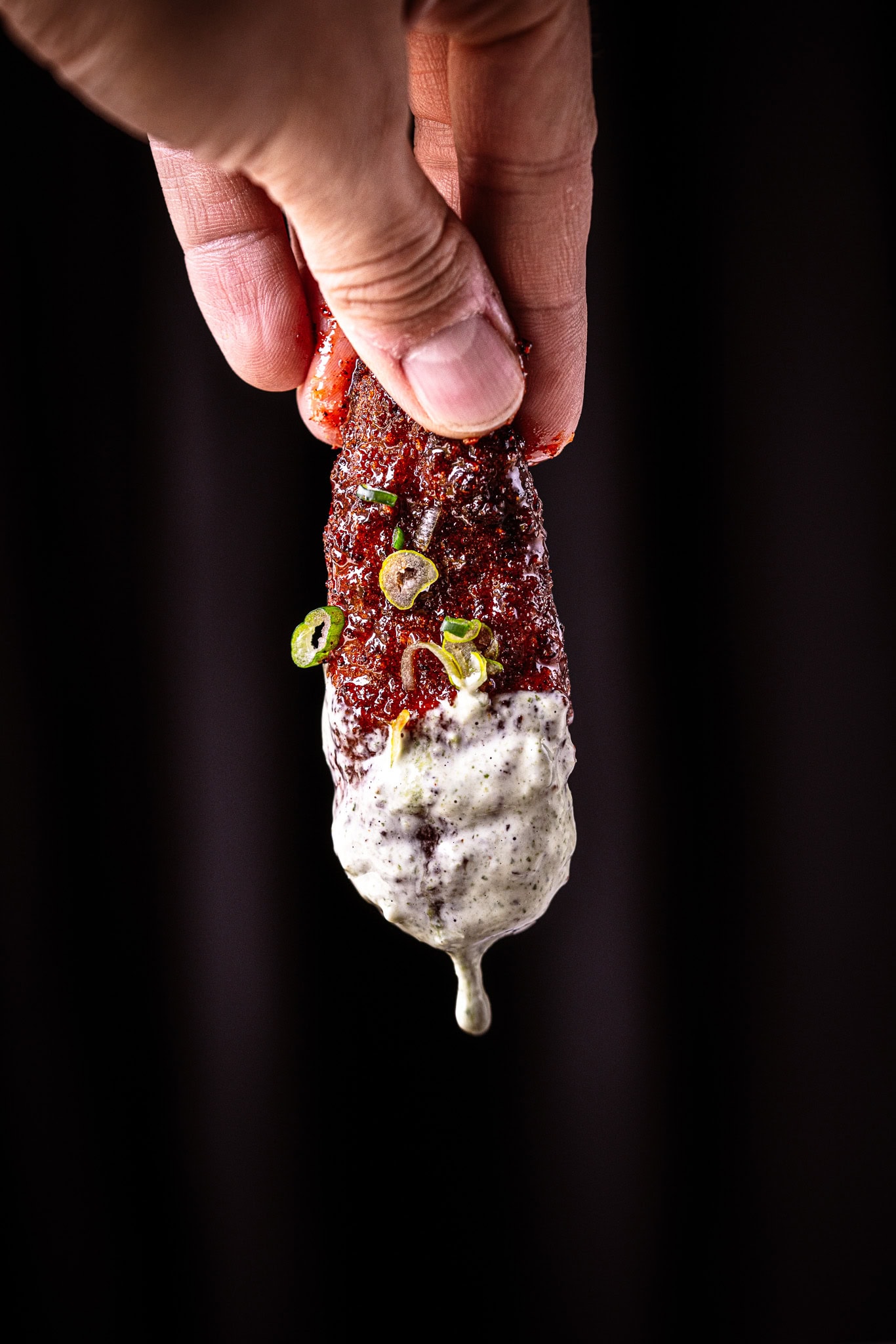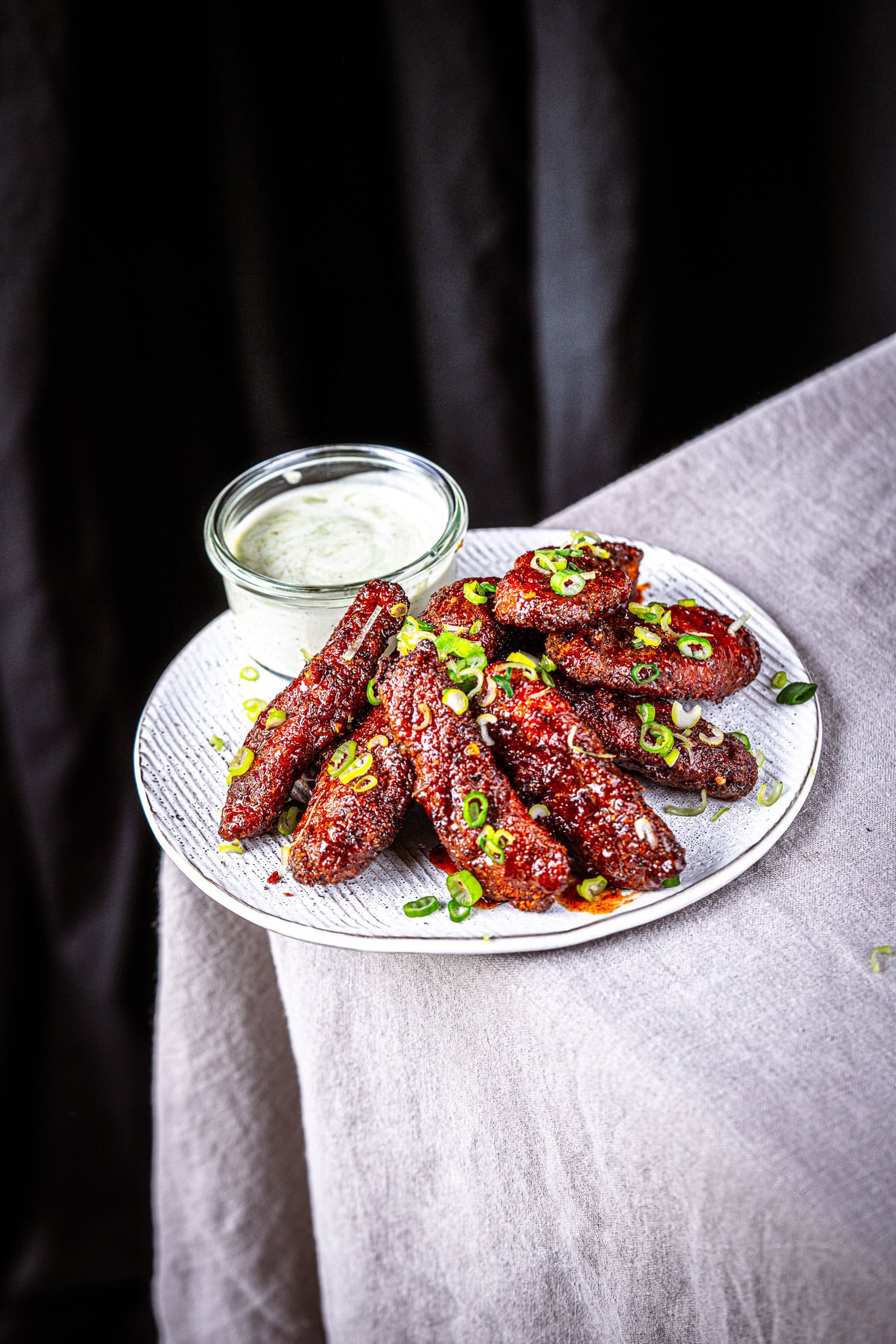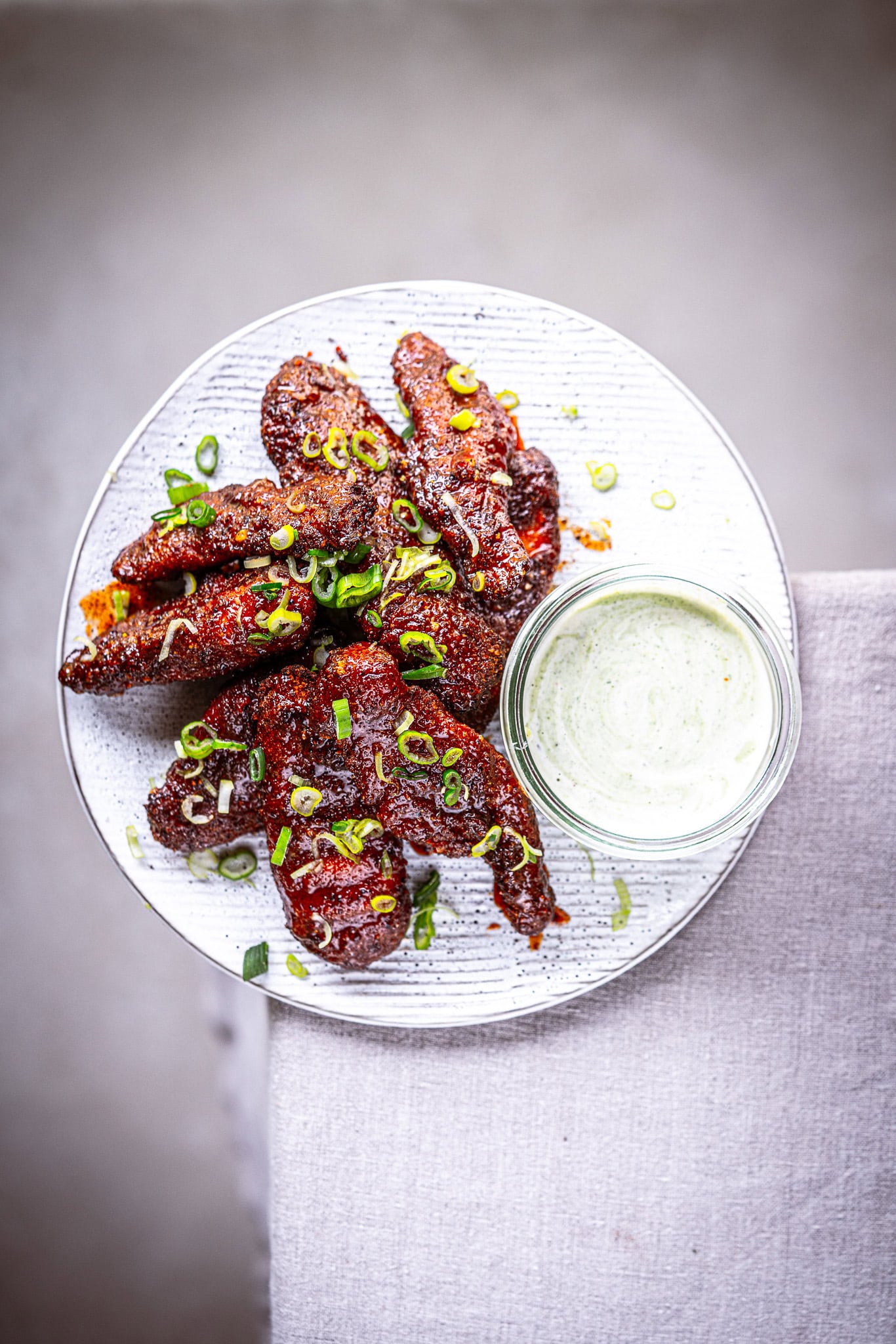 Serviere dein knuspriges Airfryer-Chicken mit dem aromatischen Sour Cream-Bärlauch-Dip und etwas frischem Jungzwiebelgrün.