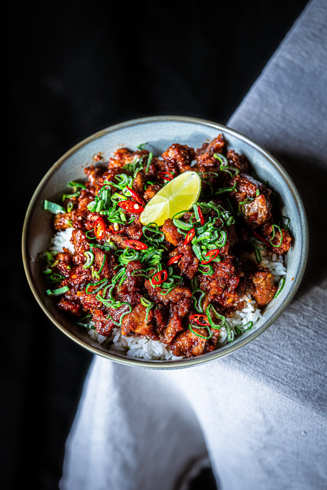 Serviere dein Crispy Chili-Beef mit Limettenreis und Jungzwiebelgrün und Chiliringen als Topping.