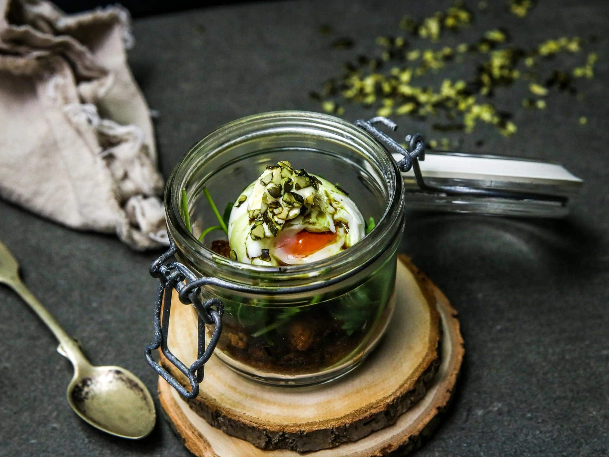 Ei im Glas ist einfach unglaublich gut und lässt sich geschmacklich ganz wunderbar variieren. Beispielsweise mit aromatischen Kräutern, gutem Olivenöl, etwas Balsamico, Mayo und Kürbiskernen. Der Wahlsteirer in mir ist on fire, kann ich dir sagen!