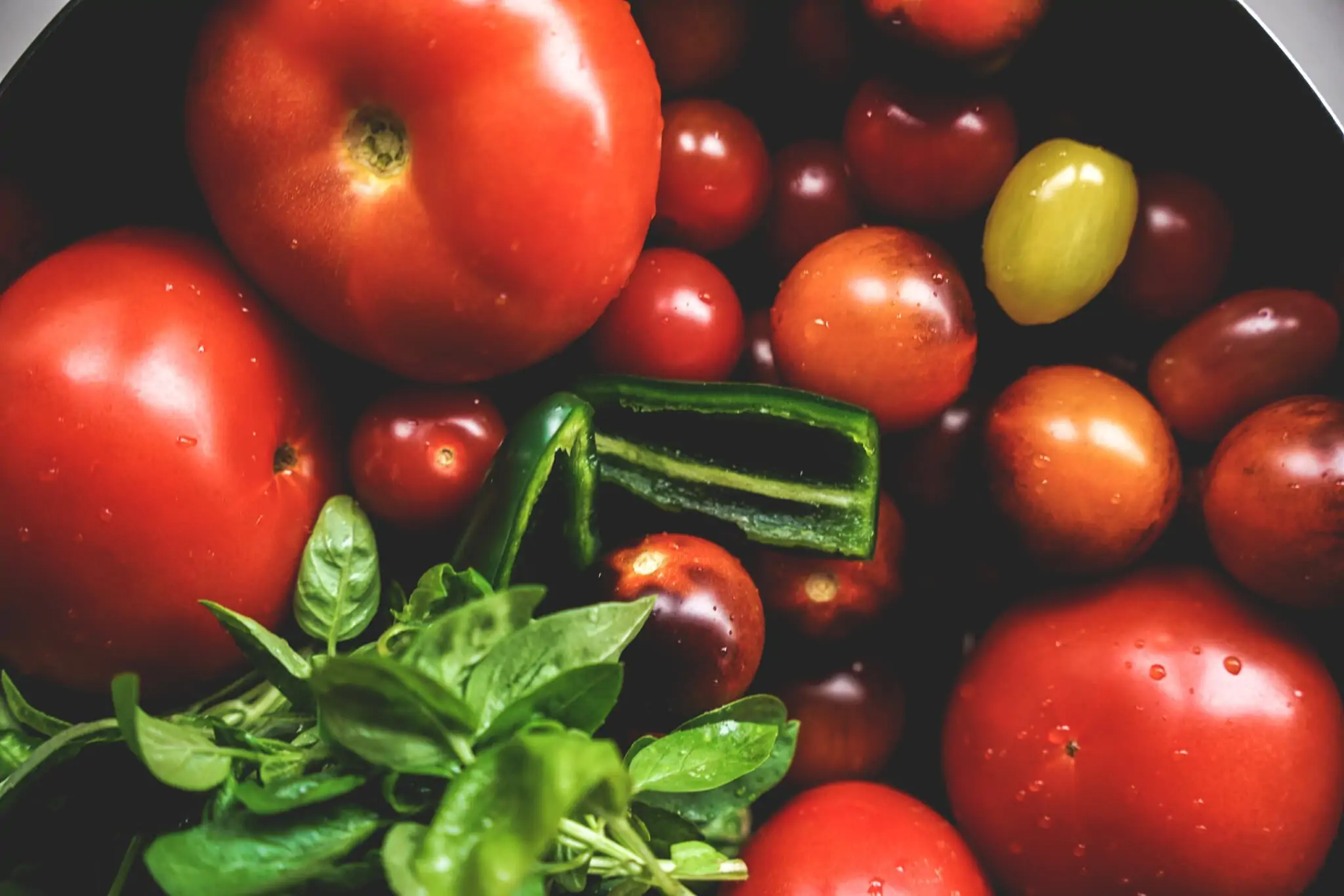 Tomaten, Jalapenos und Basilikum waschen und abtropfen lassen.