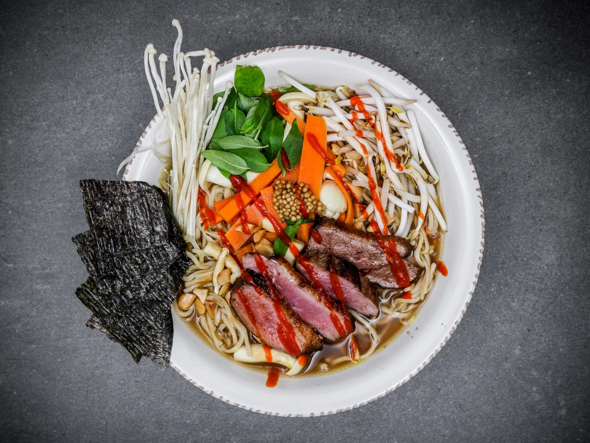 Am Ende die in Streifen geschnittene Brust darauf anrichten und etwas Sriracha drüberträufeln. Ganze Ente zubereiten à la Motion Cooking. Mahlzeit!