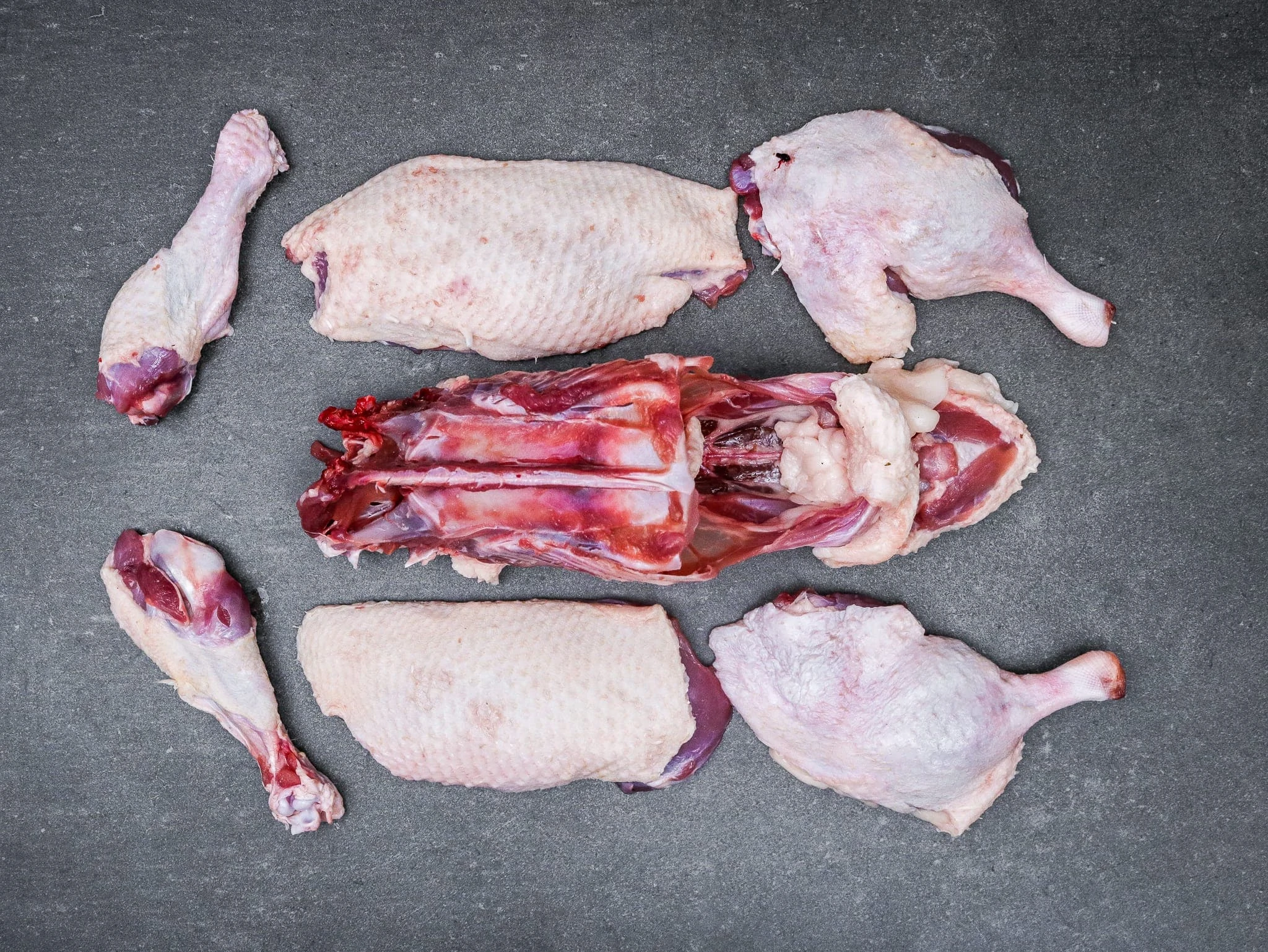 Und das war’s auch schon. Vor dir liegen nun zwei Flügel, zwei Keulen, zwei Entenbrüste und eine Karkasse. Nichts davon wird entsorgt – schon gar nicht die Karkasse!