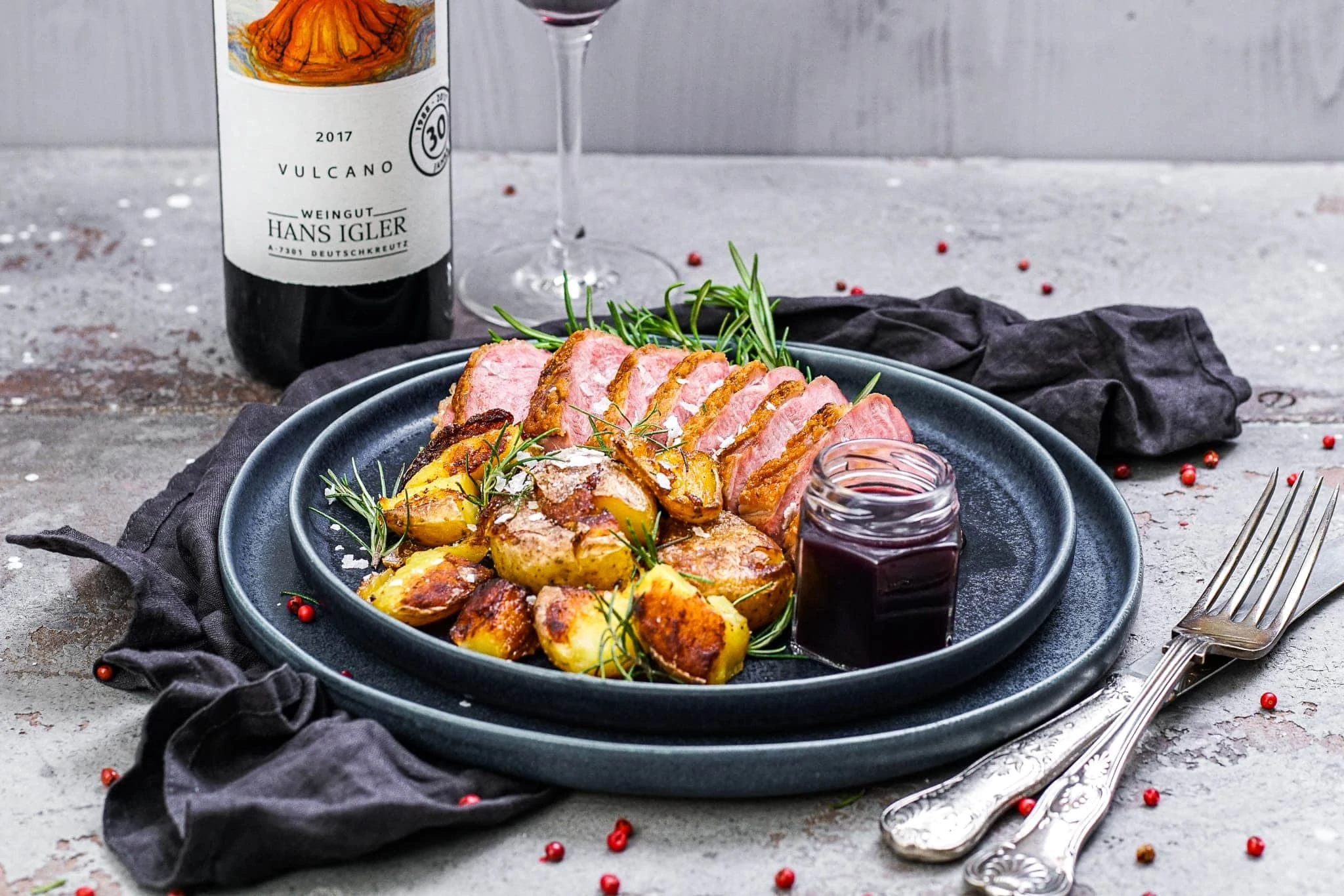 Entenbrust braten ist gar nicht schwer, versprochen. Was wir wollen? Knusprige Haut und zartrosa gegartes Fleisch in feiner Rotweinsauce. Dazu braucht es vor allem eines: richtig guten Rotwein. Dazu habe ich mich zurück in meine Heimat begeben und gleich mal einen Vulcano bei weinwelt.at geordert. Dazu kleine Erdäpfel, die zuerst gekocht und dann im Entenfett richtig schön knusprig gebraten werden. Ein wahres Gedicht. Hinweis am Rande: Der Wein passt nicht nur hervorragend ins, sondern auch zum Gericht. Cheers!