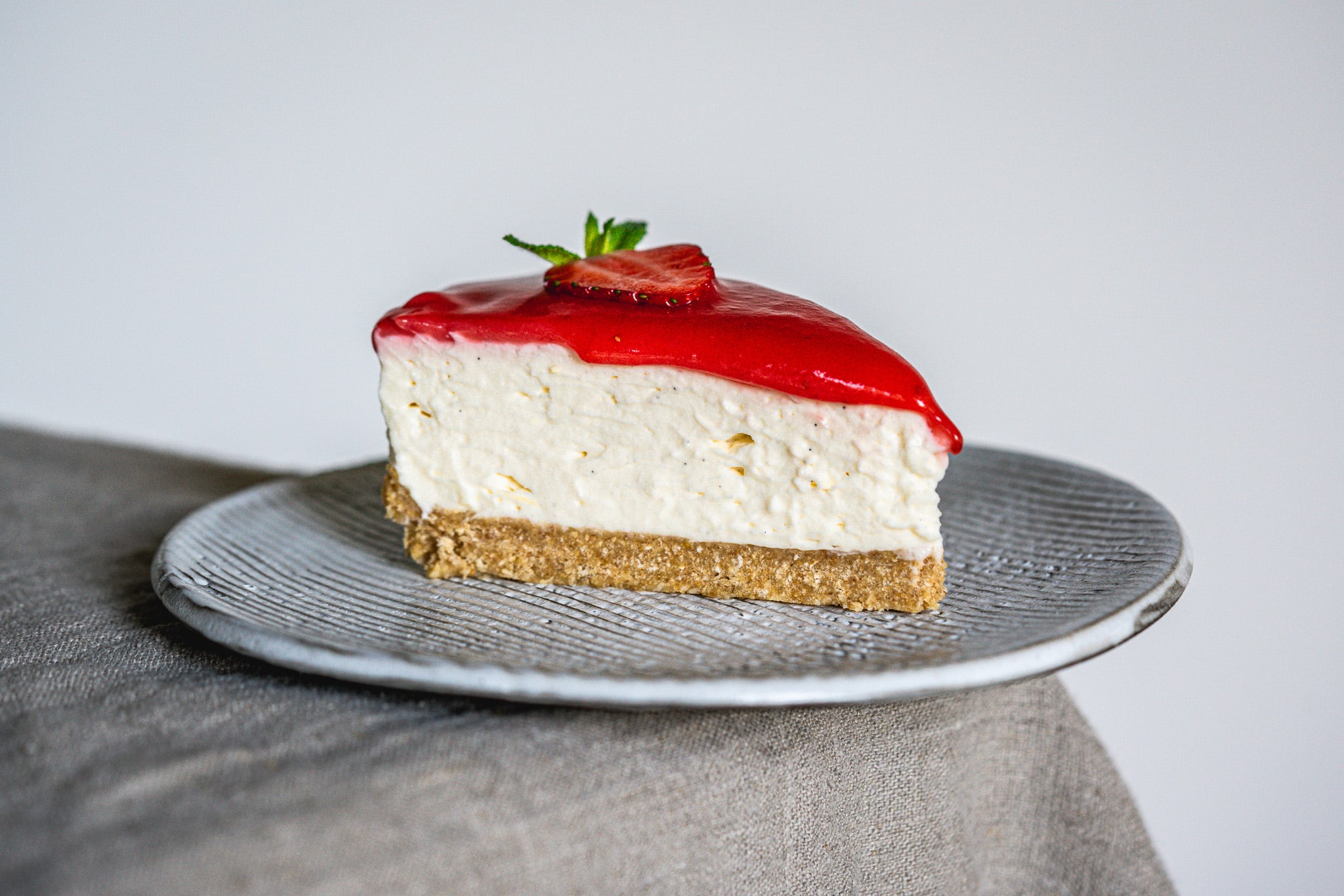 Stell den Erdbeer-Rhabarber-Cheesecake dann in den Kühlschrank und lass ihn über Nacht fest werden.