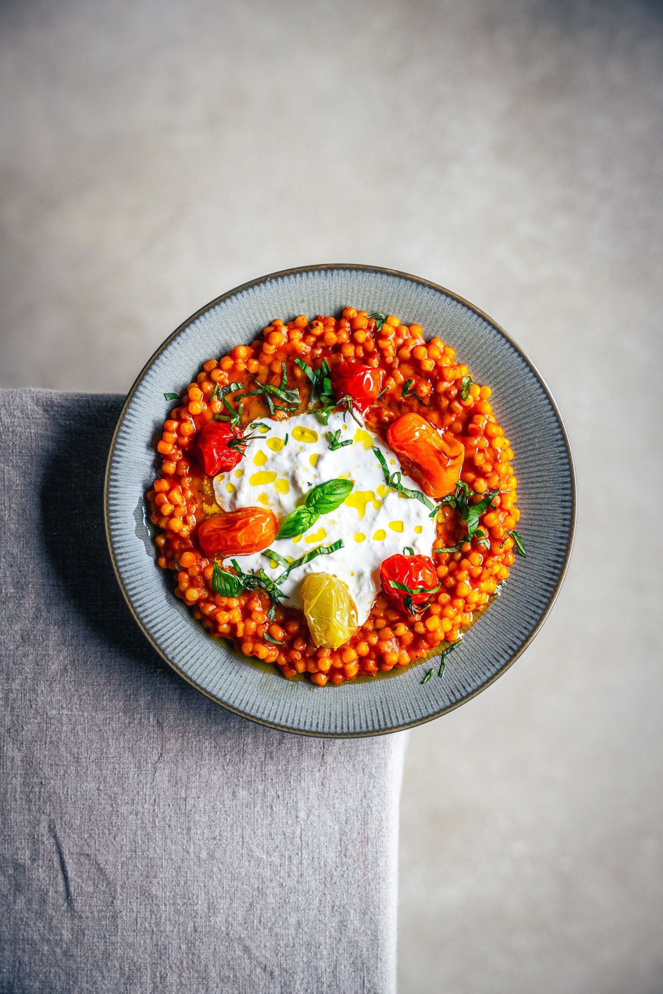 Fregola mit frischen, gerösteten Tomaten und cremiger Burrata ist ein wunderbares Sommergericht, das schnell und easy von der Hand geht. Dieses Gericht ist eine wunderbare Fusion aus gerösteten Cherrytomaten, die im Ofen zu süßen Geschmacksbomben karamellisieren, und dem Saft frischer Tomaten, die als Basis für die Fregola dient. Verfeinert mit frischem Basilikum und cremiger Burrata, macht dieses Gericht jede andere Pasta eifersüchtig.