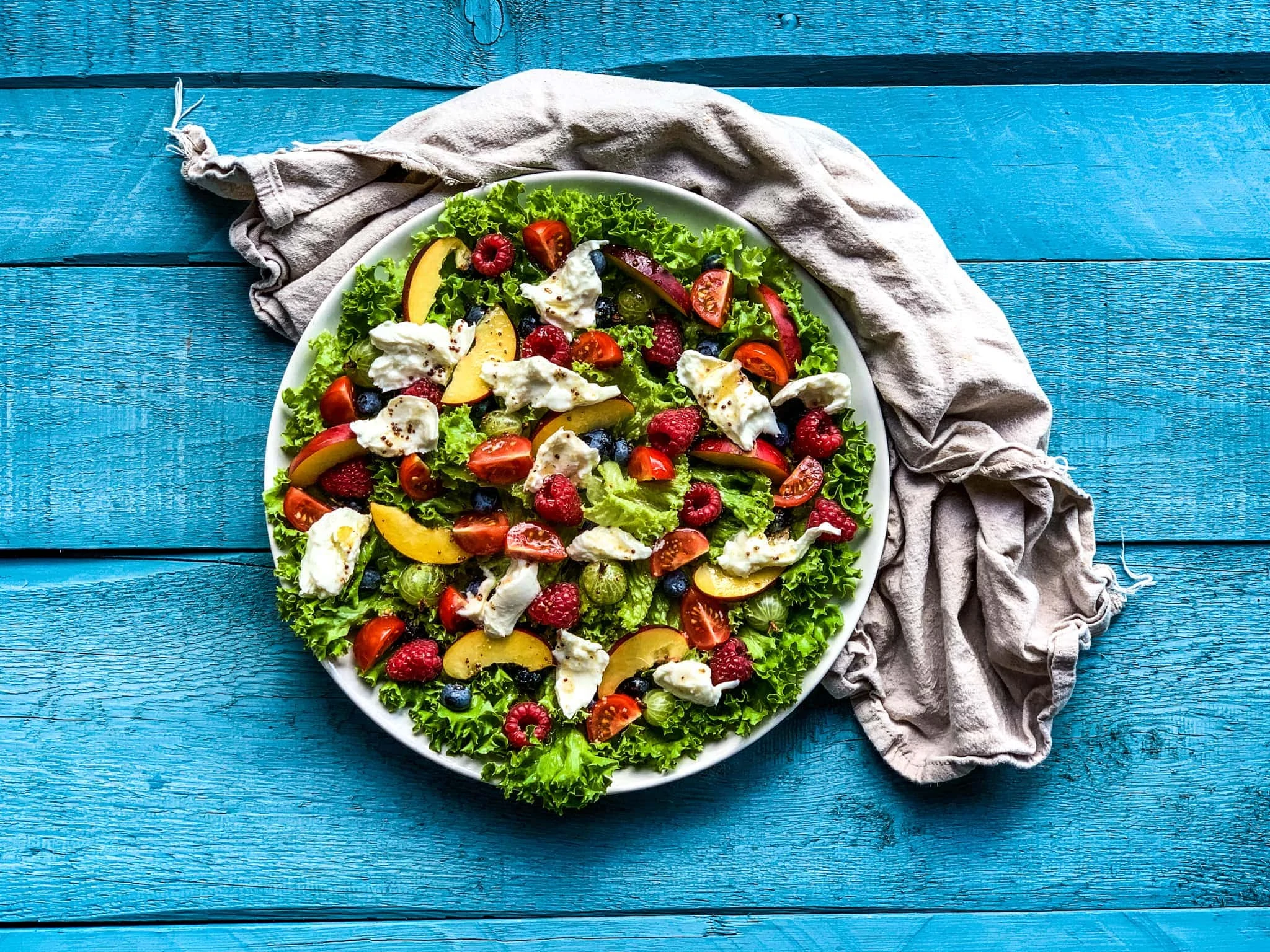 Zuerst Salat, Tomaten, Beeren und Nektarine waschen und gut abtropfen.