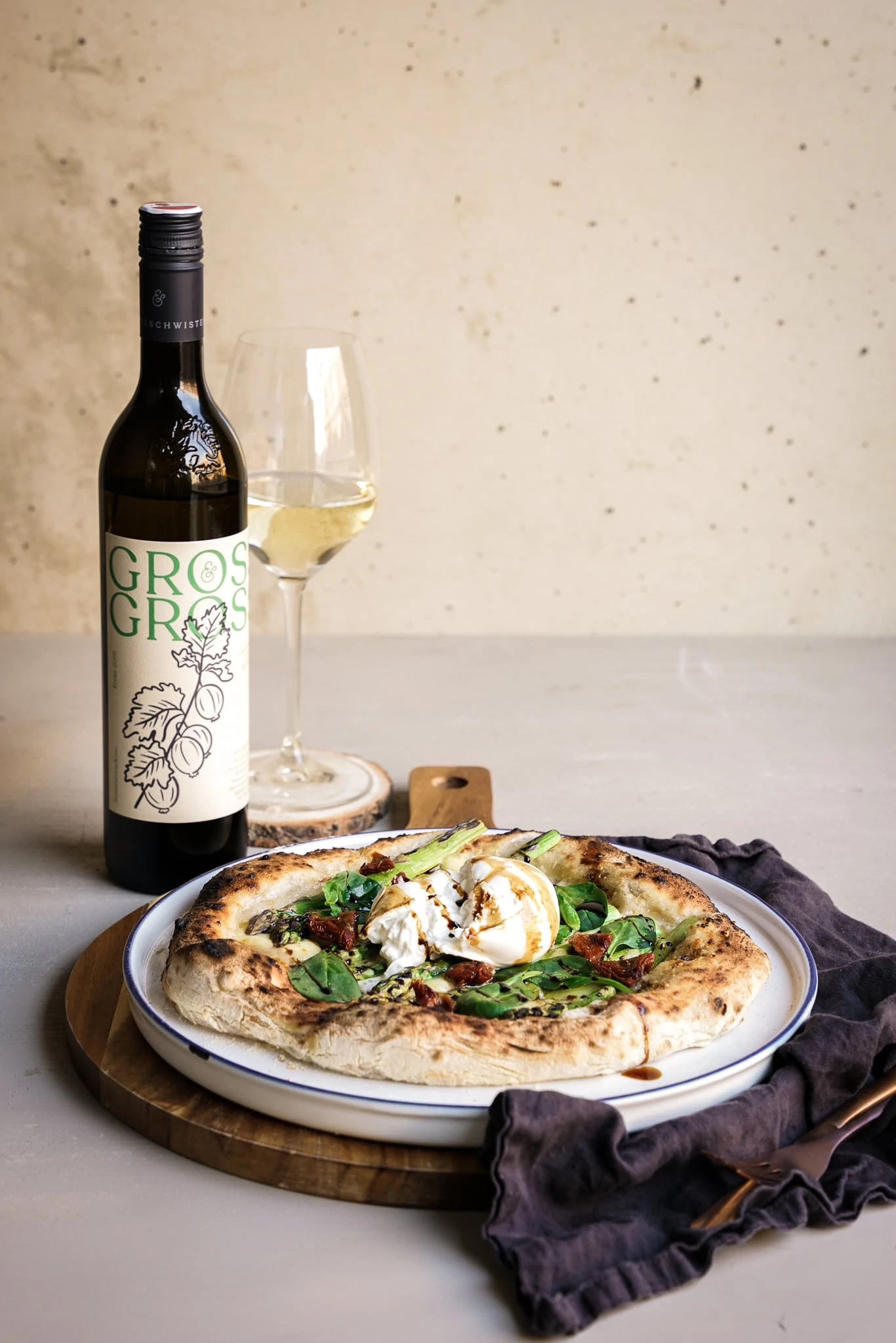 Platziere zuletzt die Burrata in der Mitte der Pizza. Dazu servierst du am besten ein Glas Gross & Gross Sauvignon Blanc.