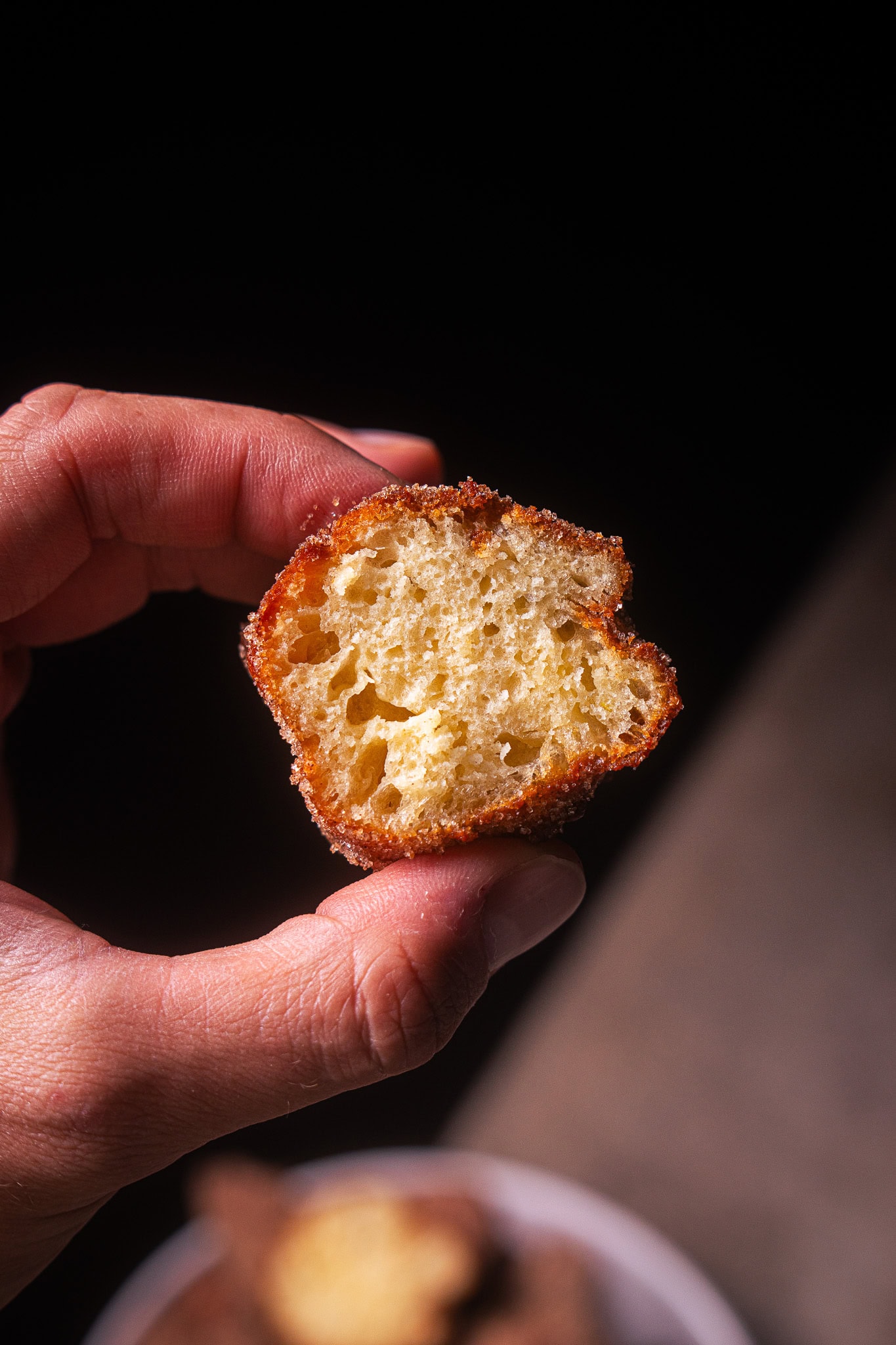 Mit einem Löffel kleine Portionen vom Teig abstechen oder mit leicht bemehlten Händen kleine Stücke abdrehen und direkt ins heiße Fett gleiten lassen.