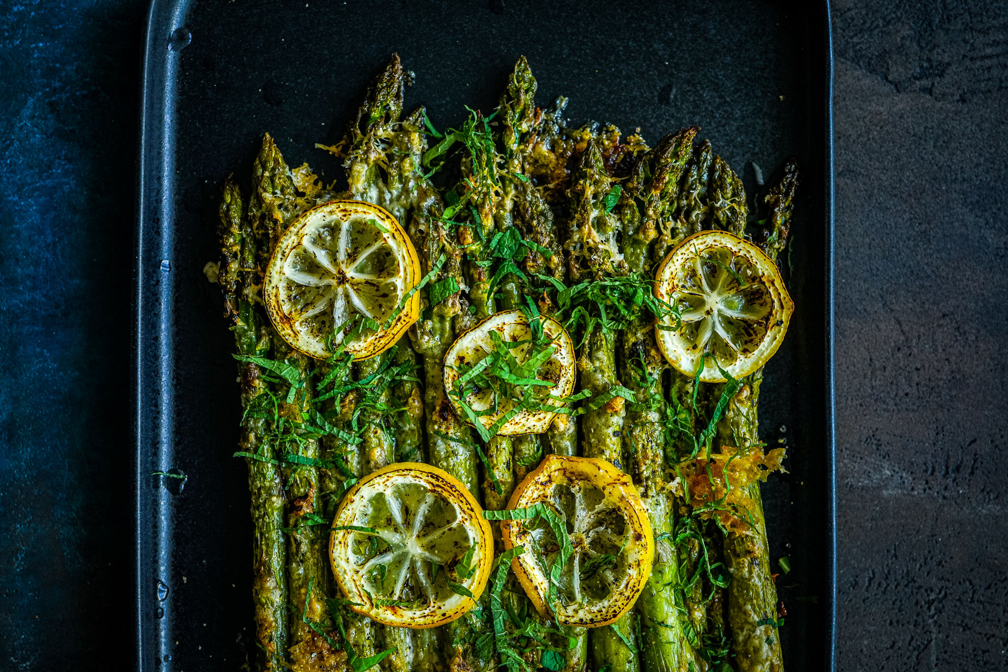 Spargel nun aus dem Ofen nehmen, die gerösteten Zitronenscheiben über dem Spargel auspressen und sofort servieren.