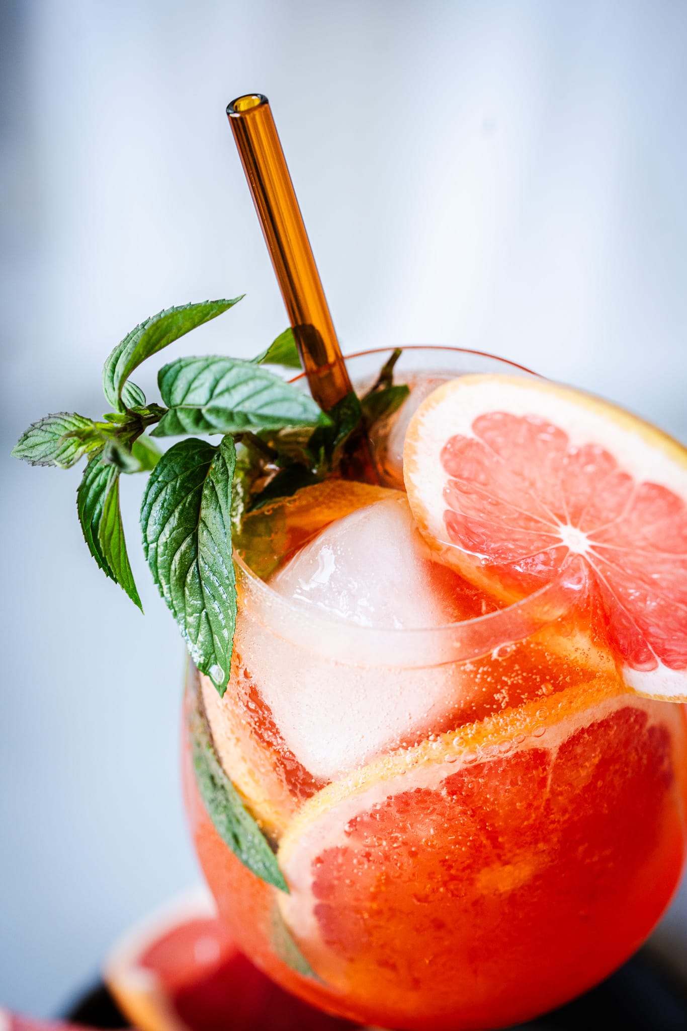 Garniert wird der Cocktail mit einem Grapefruitschnitz und frischer Minze.