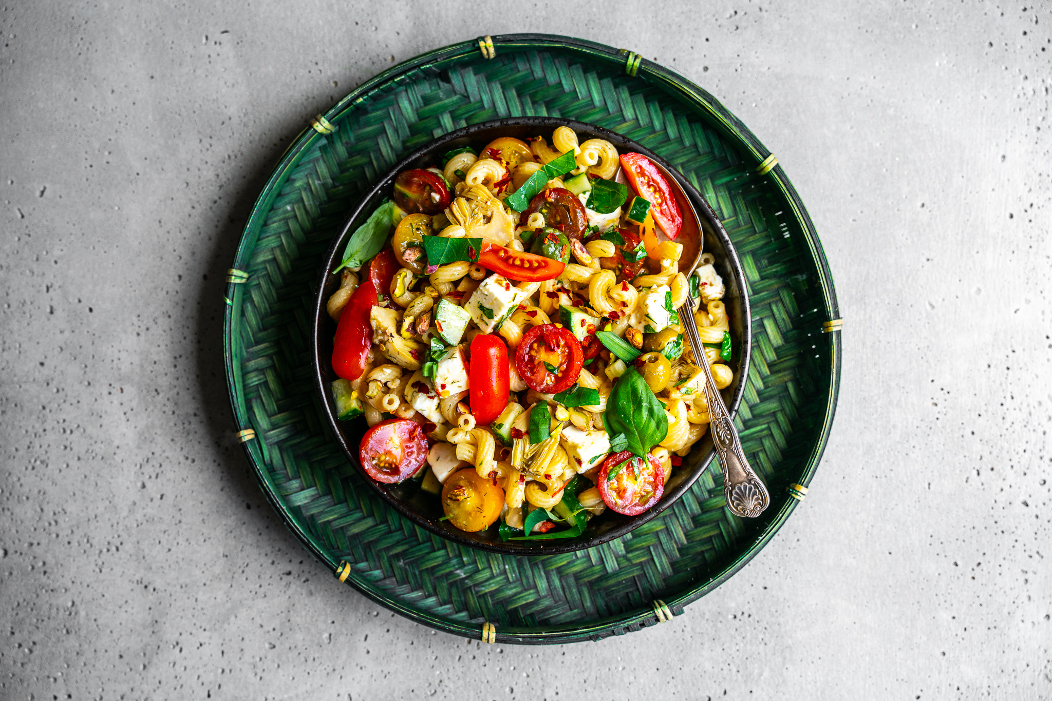 Köstliche Pasta, cremiger Feta, jede Menge frische Kräuter, Gewürze und knackiges Gemüse – dieser griechische Nudelsalat landet bei uns immer öfter auf dem Lunchteller. Er lässt sich übrigens auch fabelhaft und in Windeseile vor oder gleich direkt im Büro zubereiten. Einfach perfekt sowohl für zu Hause als auch in der Arbeit.