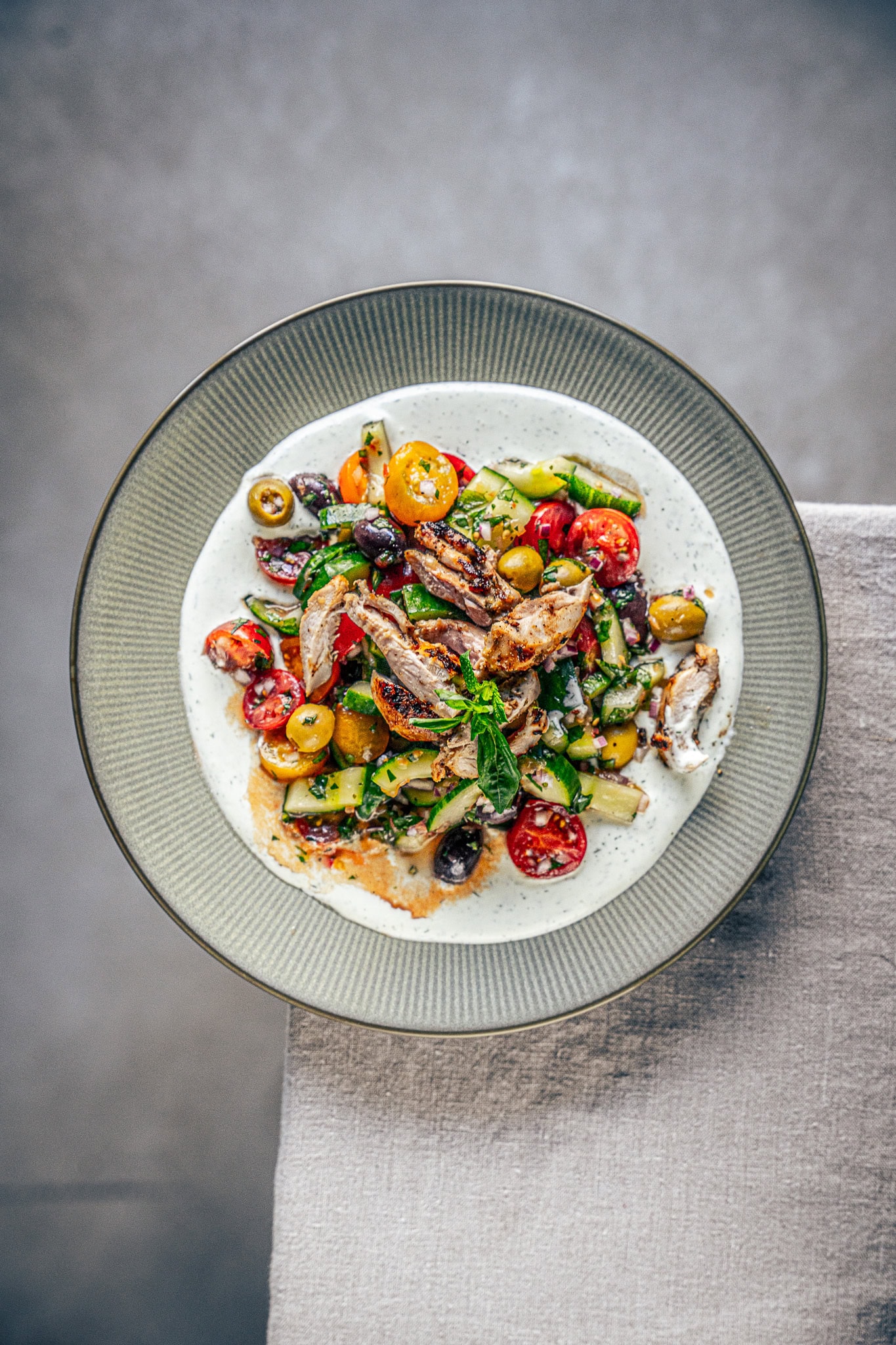 Mein griechischer Salat mit Grillhuhn und Feta-Dip ist das perfekte Gericht für heiße Sommertage. Easy, köstlich und ratzfatz zubereitet! Teste das einfache Rezept am besten noch heute und hol dir die Aromen des Mittelmeers direkt auf den Teller! Knackiger Salat, saftiges Hühnchen und unwiderstehlich-cremiger Feta-Dip: Diese einfache Mahlzeit fängt das Beste der griechischen Küche mühelos ein und bringt es im Handumdrehen zu dir nach Hause. Hier werden knackige Cherrytomaten, kühle Gurke und eine Mischung aus grünen und schwarzen Oliven mit einem frischen, tomatigen Dressing kombiniert. Das Highlight dieses Gerichts ist das zart gegrillte Hühnchen, mariniert in einer Mischung aus Zitrone, Knoblauch und Oregano. Der cremige Feta-Dip, verfeinert mit frischem Dill, rundet das Ganze wunderbar ab und gibt dem Salat eine luxuriöse Textur und reichen Geschmack.