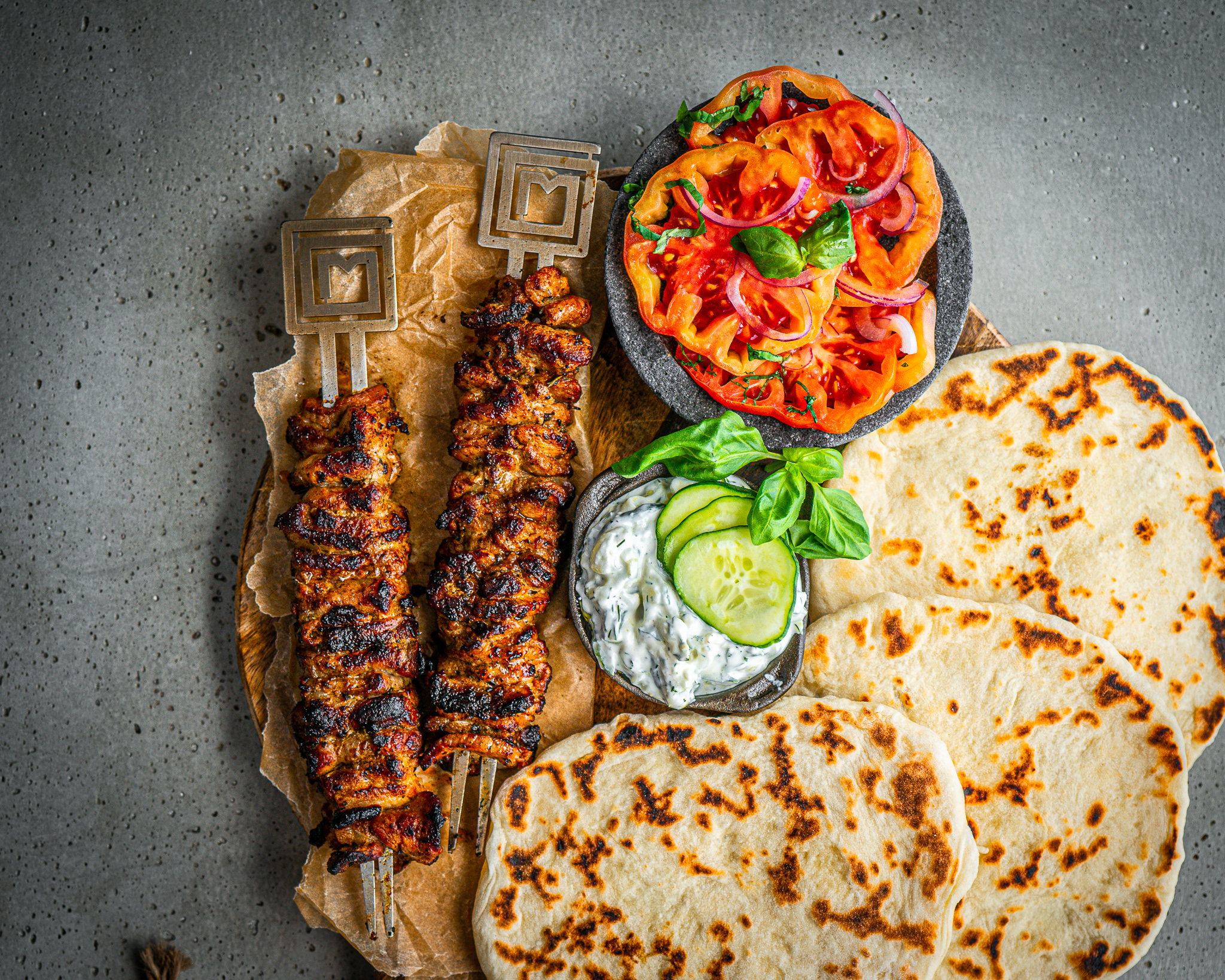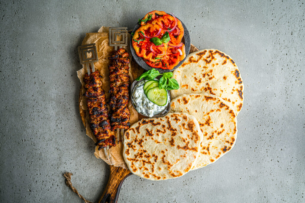 Das Gyros dann mit frisch gebackenem Naan, marinierten Tomaten und Tzatziki servieren.