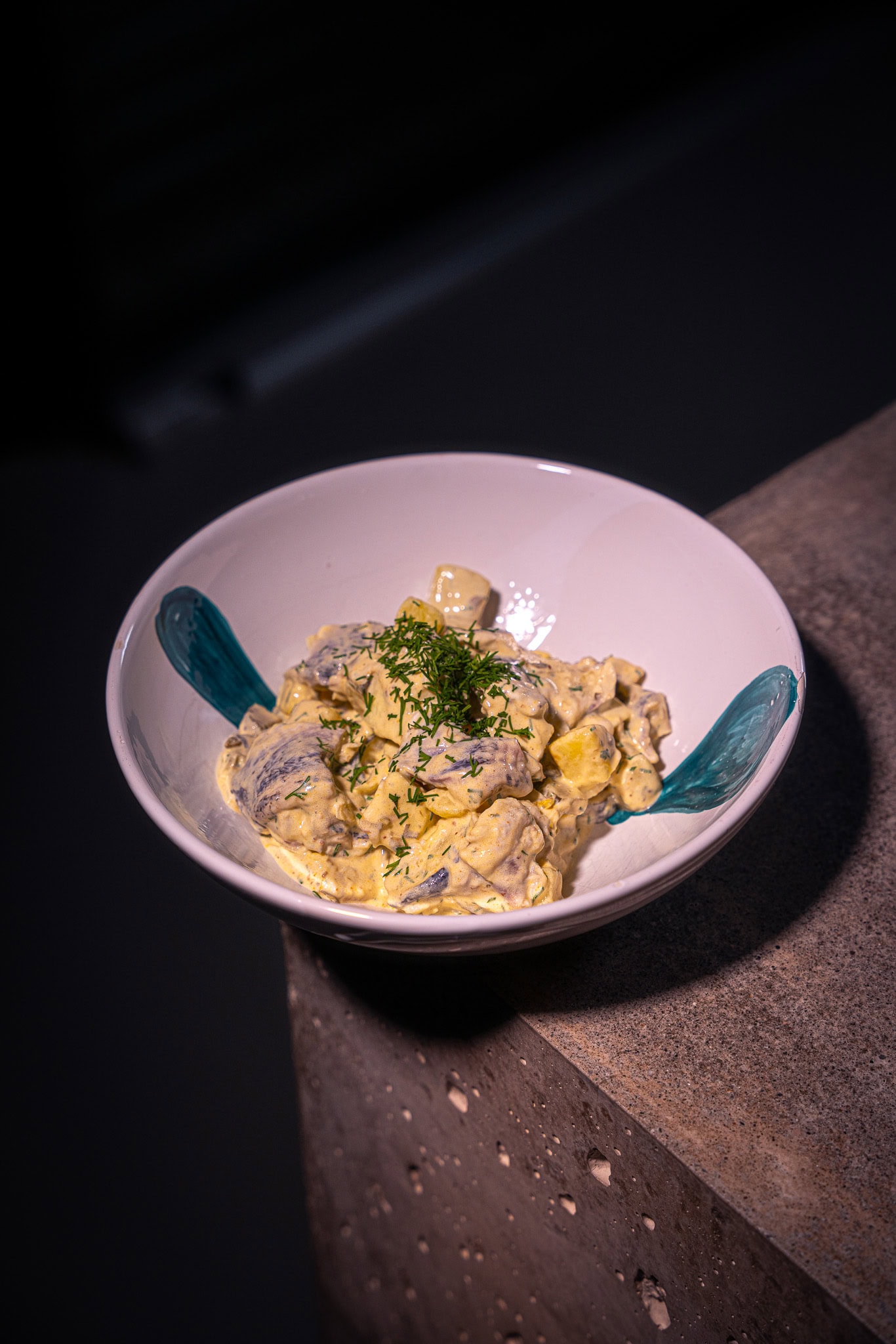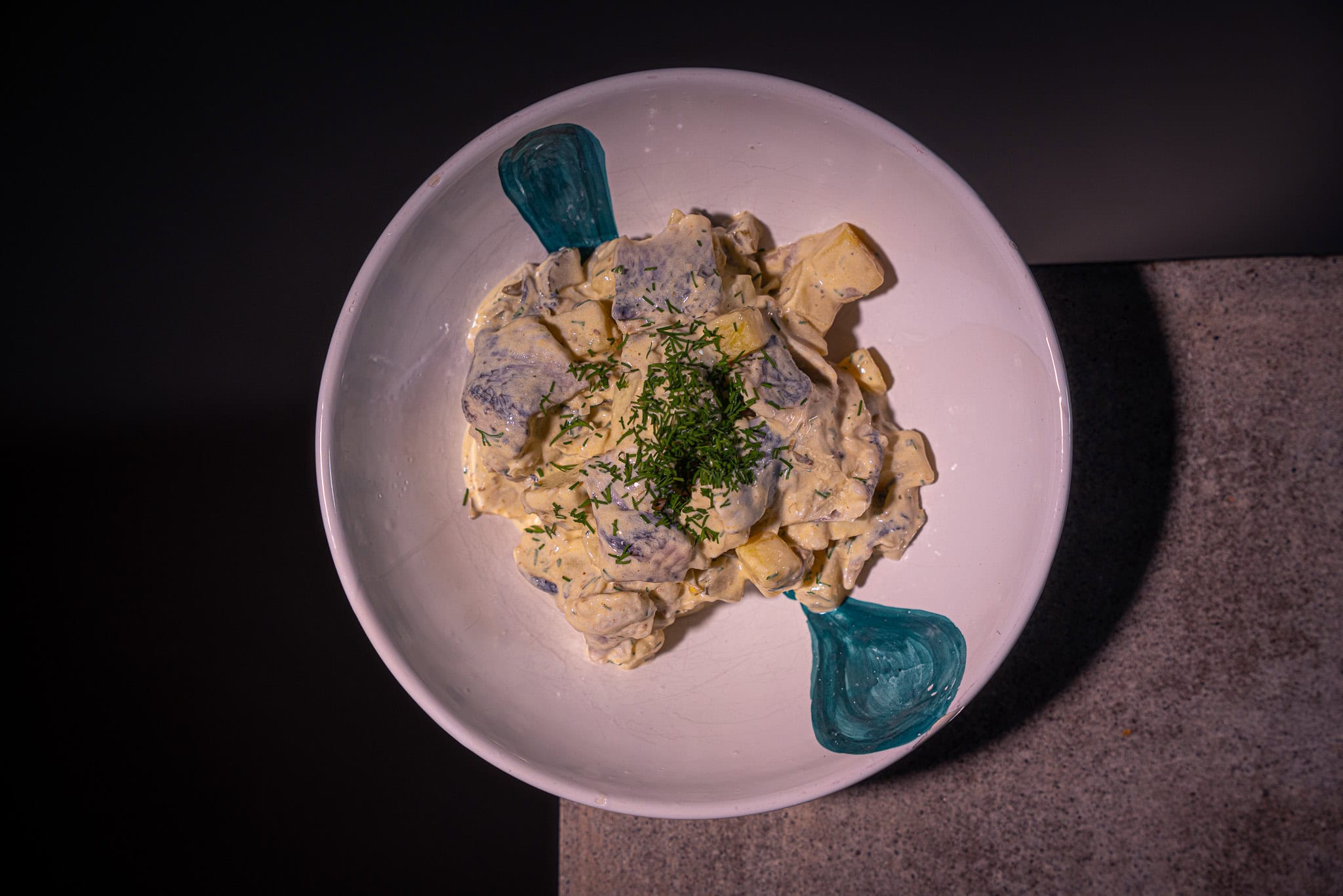 Dazu Skyr mit einem Spritzer Zitronensaft, der -zesten, gehacktem Schnittlauch, sowie einer Prise Salz und Pfeffer glatt rühren.