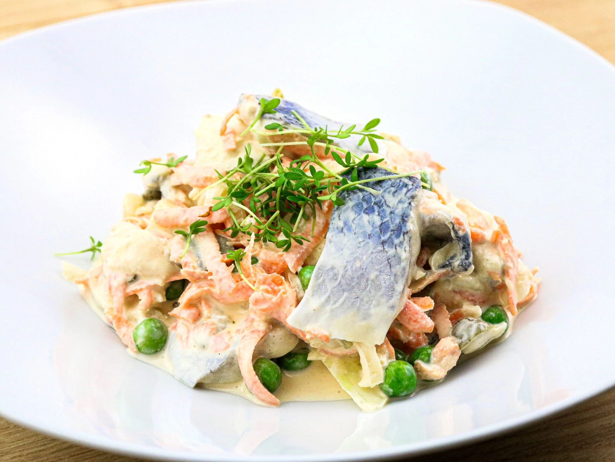Beides kommt, ebenso wie Erbsen, Mayonnaise, Joghurt, Senf, Salz und Pfeffer in die Schüssel.