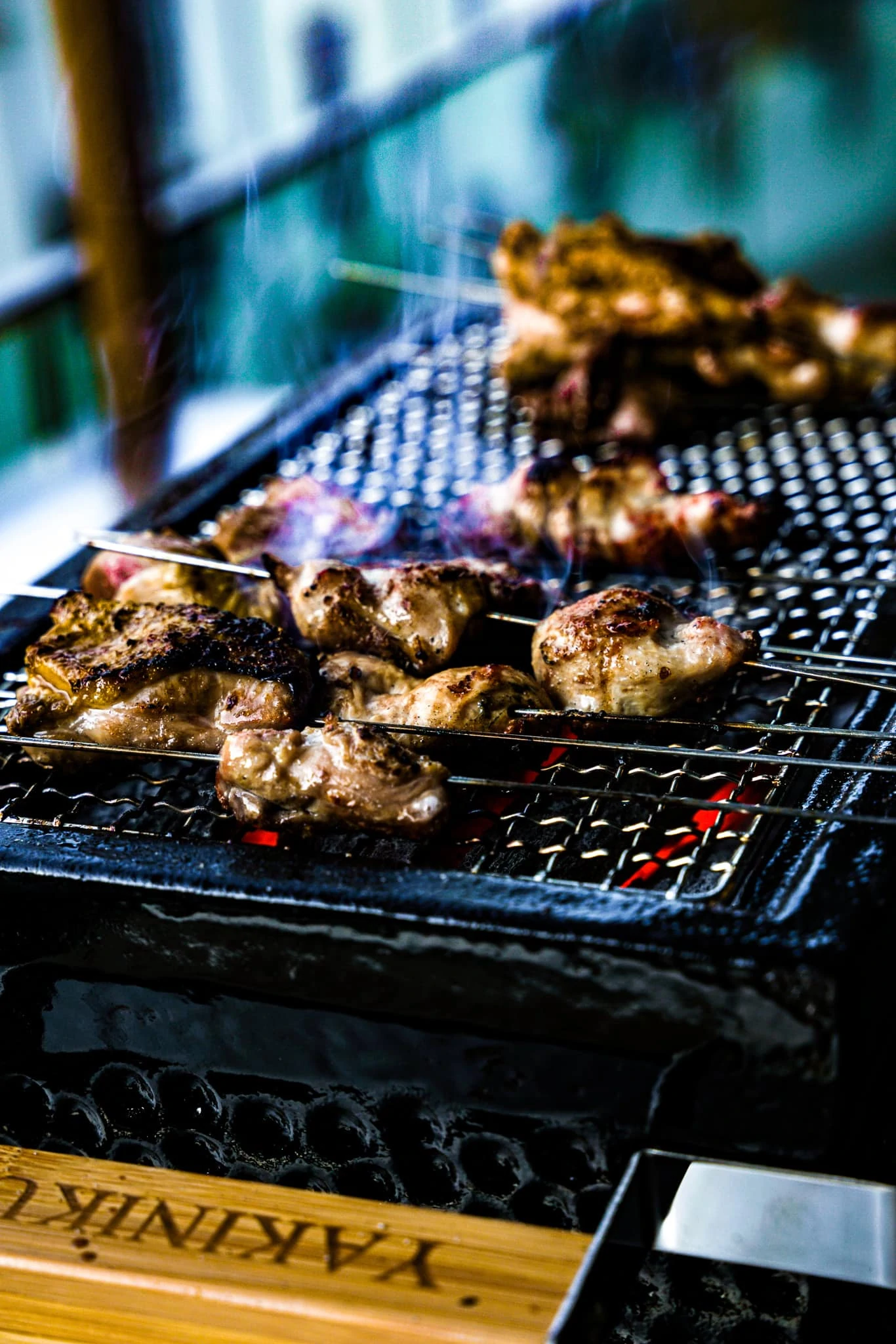 Fündig geworden bin ich beim Hersteller Yakinuku und nun unendlich froh, so einen Grill endlich mein Eigen nennen zu dürfen. Befeuert wird das schicke Teil mit glühender Binchotan-Kohle, die unheimlich lange und heiß glüht. Eine nicht gerade kostengünstige Kohle-Art, die aber nach dem Gebrauch mit einem Kübel Wasser gelöscht und dann getrocknet werden kann. Meiner Erfahrung nach klappt das im Schnitt etwa zweimal. Es macht unglaublich Spaß damit zu grillen, die Hitze ist einfach enorm und das merkt man. Auch am Hühnchen Yakitori. Knuspriges, saftiges, perfekt gegartes Hühnchen. Genauso, wie es sein soll!