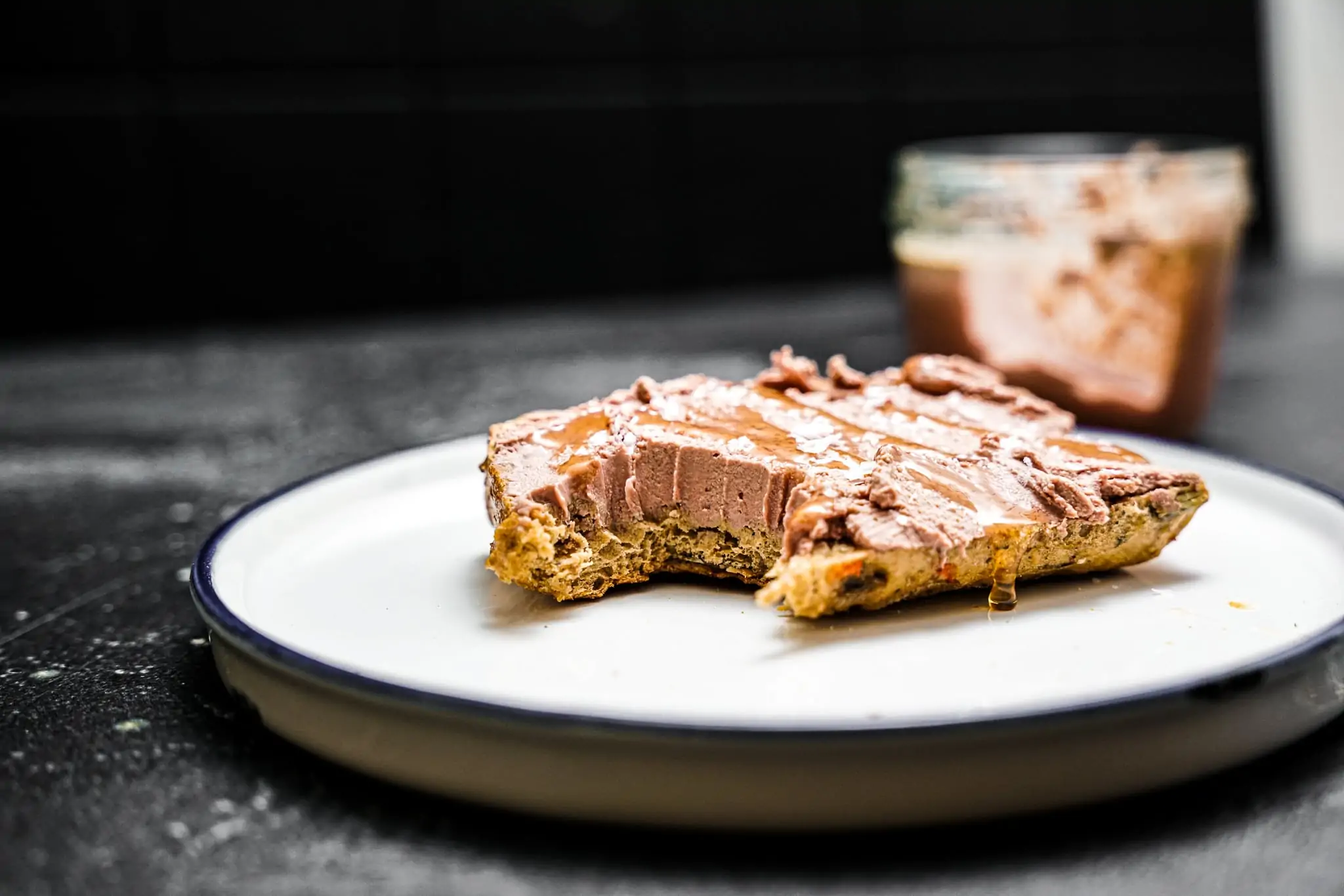 Auf dunkles Brot streichen, etwas Honig darüber träufeln und mit Salzflocken garnieren.