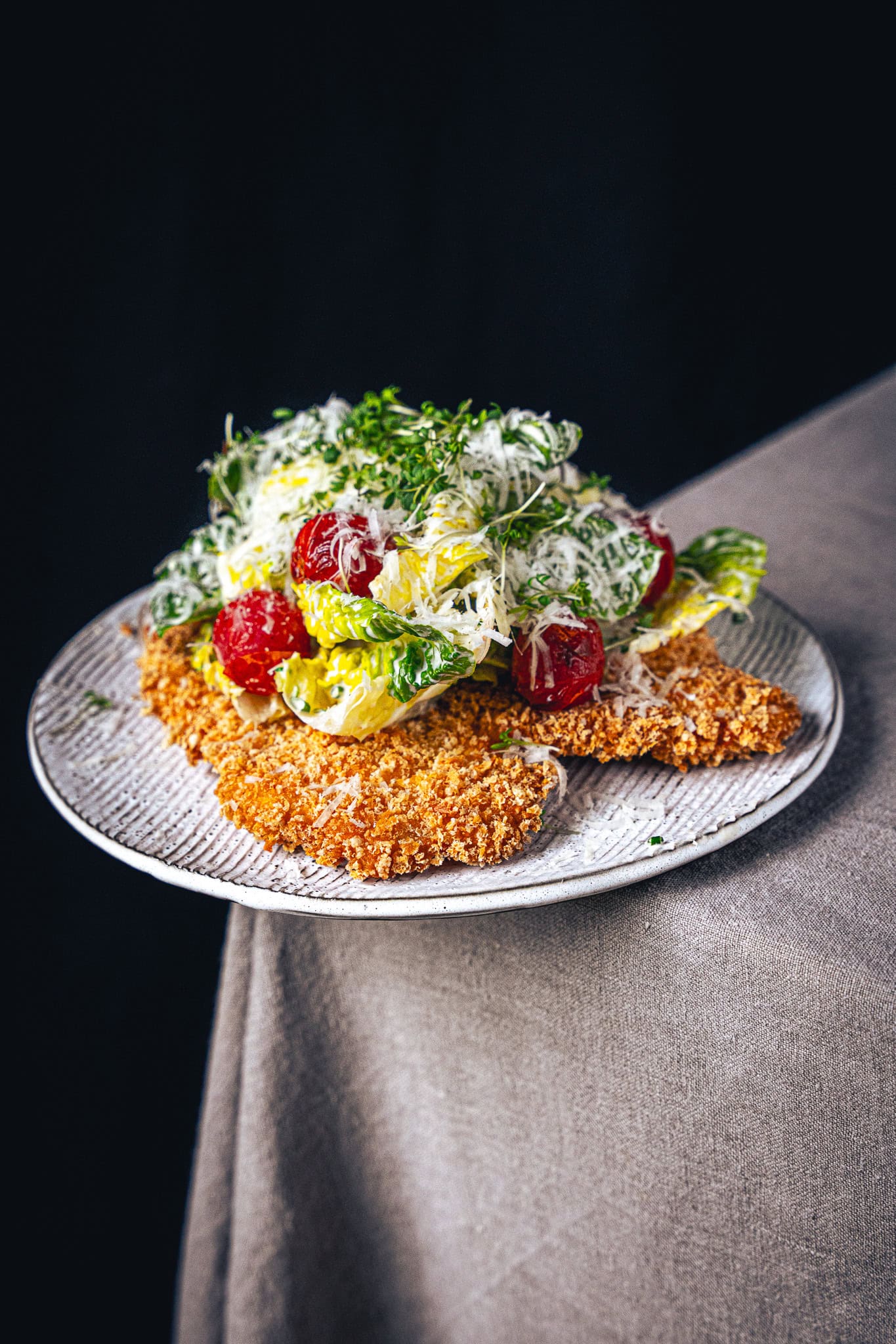 Mein Hühnerschnitzel Caesar Style ist der Beweis dafür, dass Salat auch ruhig mal mit deftigen Wirtshausklassikern anbandeln darf – besonders, wenn der Hunger recht groß daherkommt. Zu zartem Hendlschnitzel in extra-knusprigen Pankobröseln und mit würzigem Dressing sagt schließlich nicht mal der größte Salatmuffel Nein. Wieso auch? Cremig, crunchy, classic! Genauso, wie ich’s am liebsten hab!