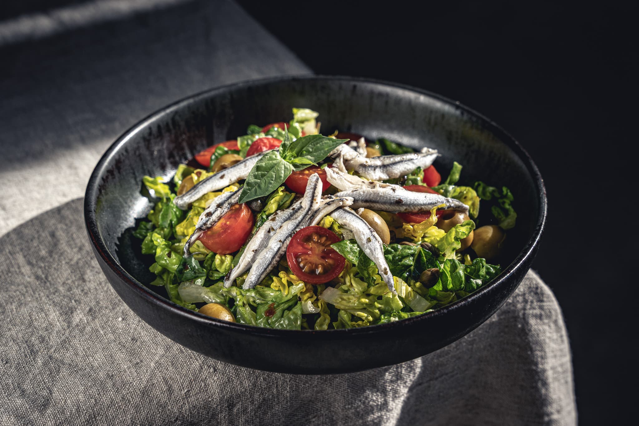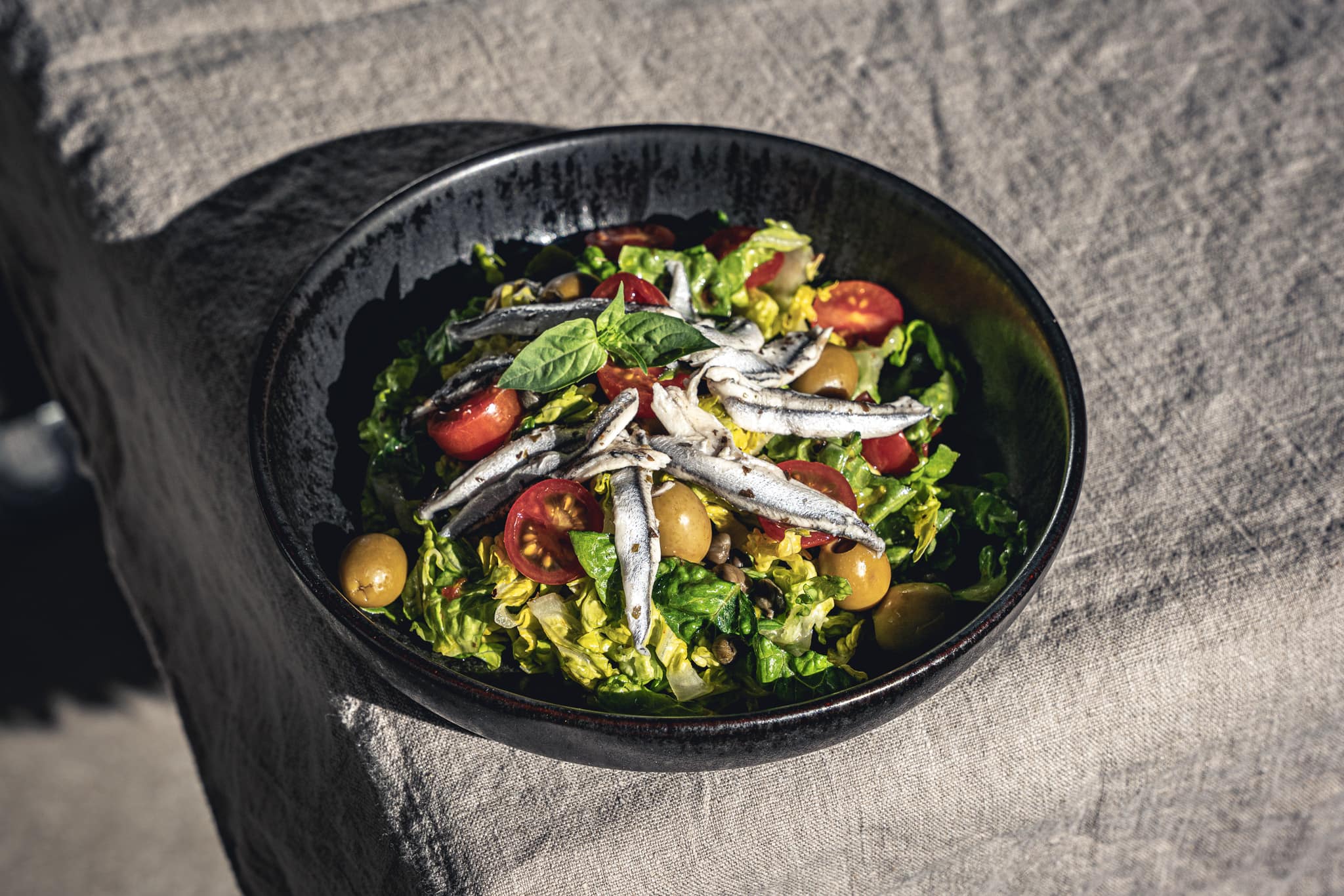 Den Salat nun mit den Alici, Kapern, Oliven und halbierten Cherrytomaten garnieren.