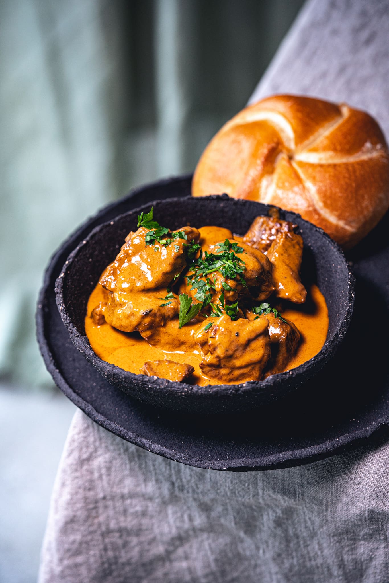 Kalbsrahmgulasch ist nicht umsonst ein unglaublich beliebter Klassiker der Wiener Küche: Butterzartes Biofleisch trifft auf würzig-cremige Sauce – wer kann da schon Nein sagen? Dazu serviere ich übrigens am liebsten hausgemachte Butterspätzle oder einfach eine frische Semmel vom Bäcker meines Vertrauens. Keep it simple, dieses Gericht spricht ohnehin für sich selbst!