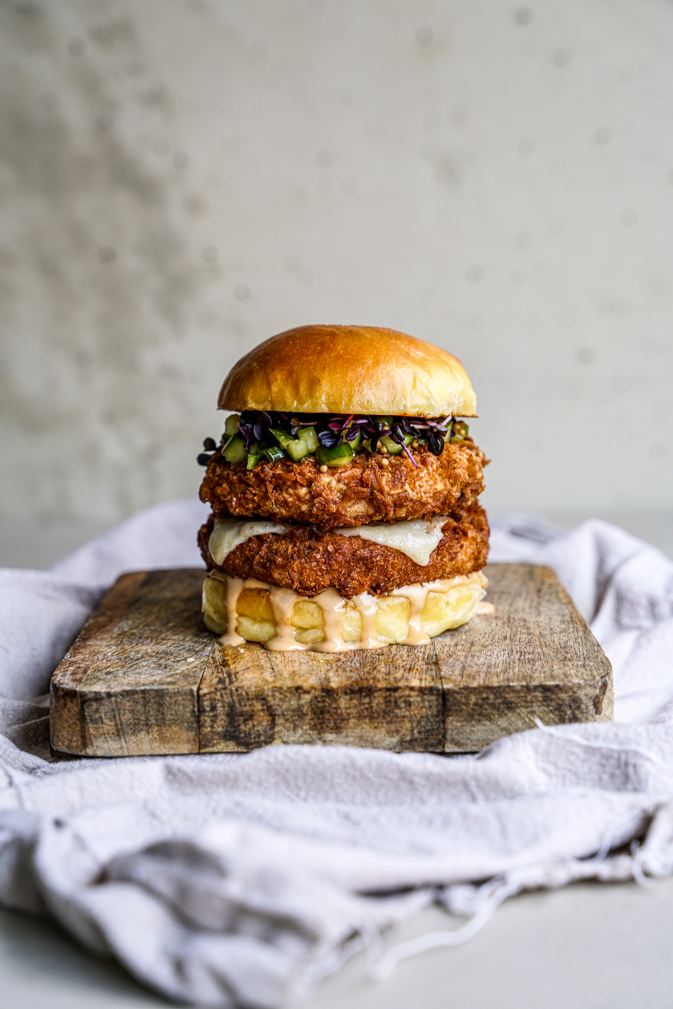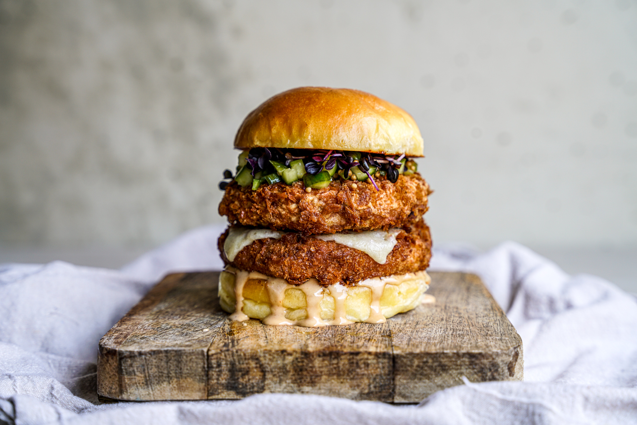 Zuerst eine Bun-Hälfte, dann Burger Sauce, frittiertes Patty, Pickles, viel frische Kresse und den „Burger-Deckel“ – fertig!