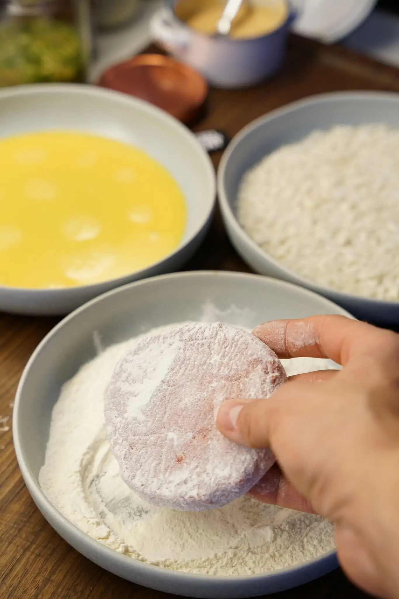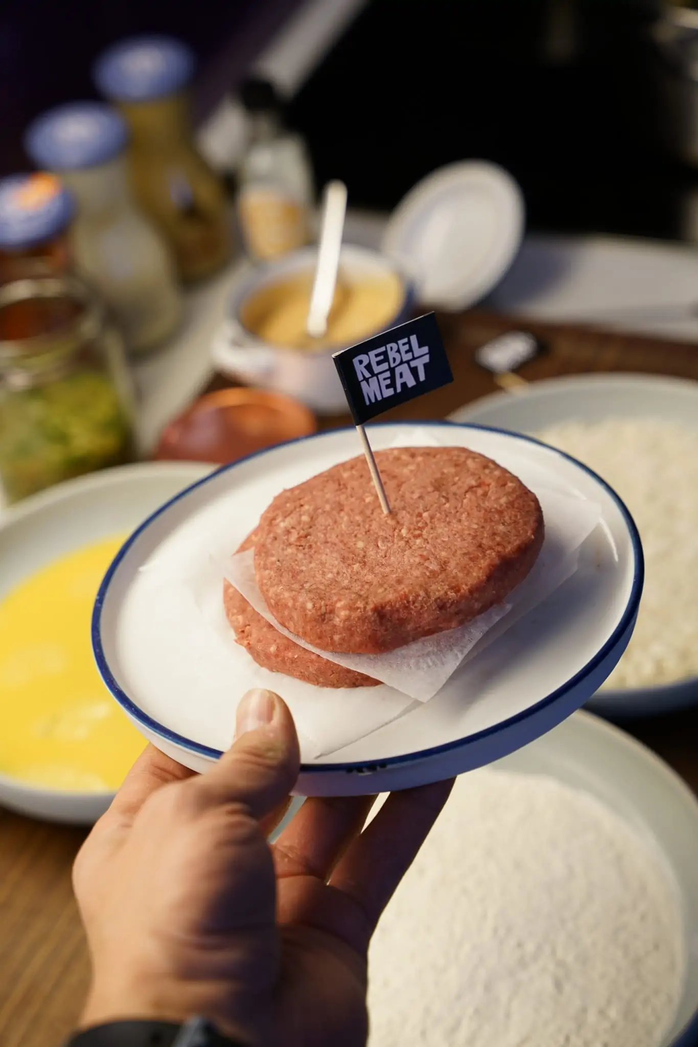 Mehl, verquirltes Ei und Brösel in drei Teller geben und die Rebel-Meat-Burger-Patties panieren.