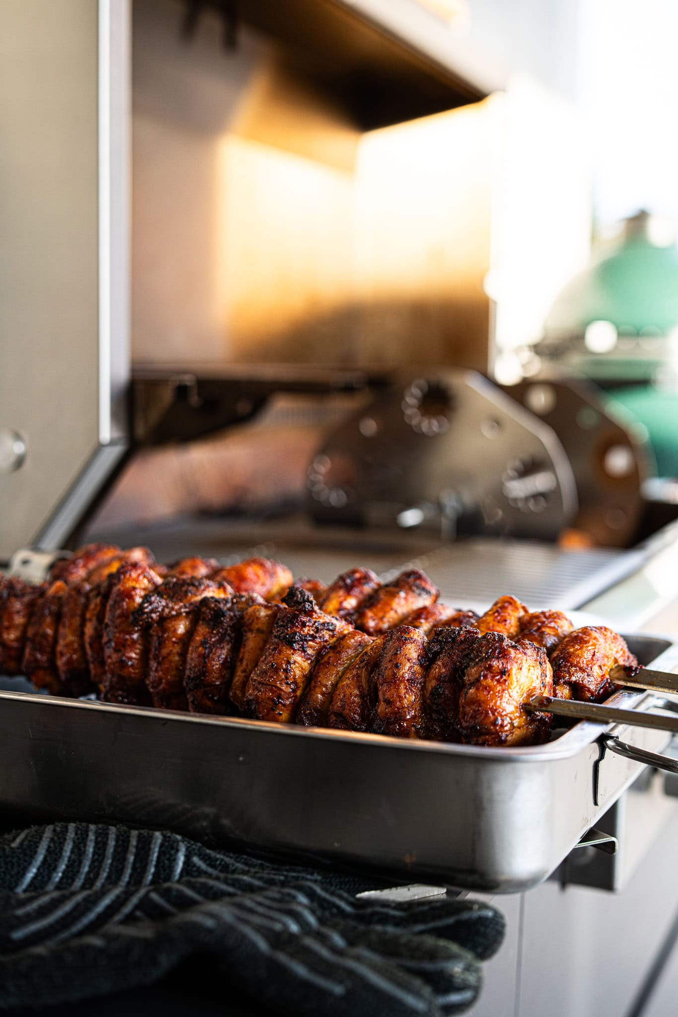 Im Grill einspannen und drehen lassen. Ich lass dafür einen Brenner auf vollgas bei geschlossenem Deckel laufen. 10 bis 20 Minuten.