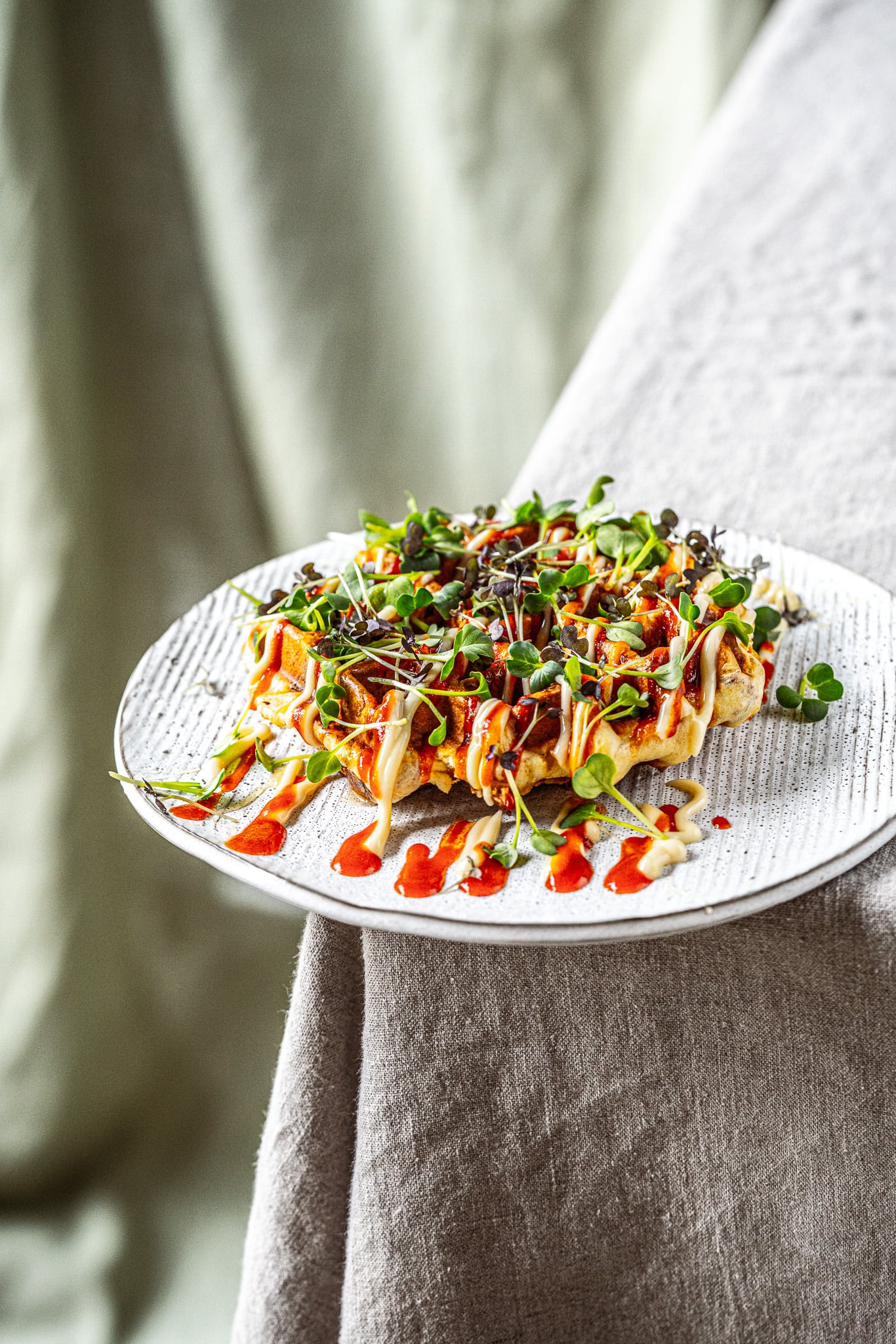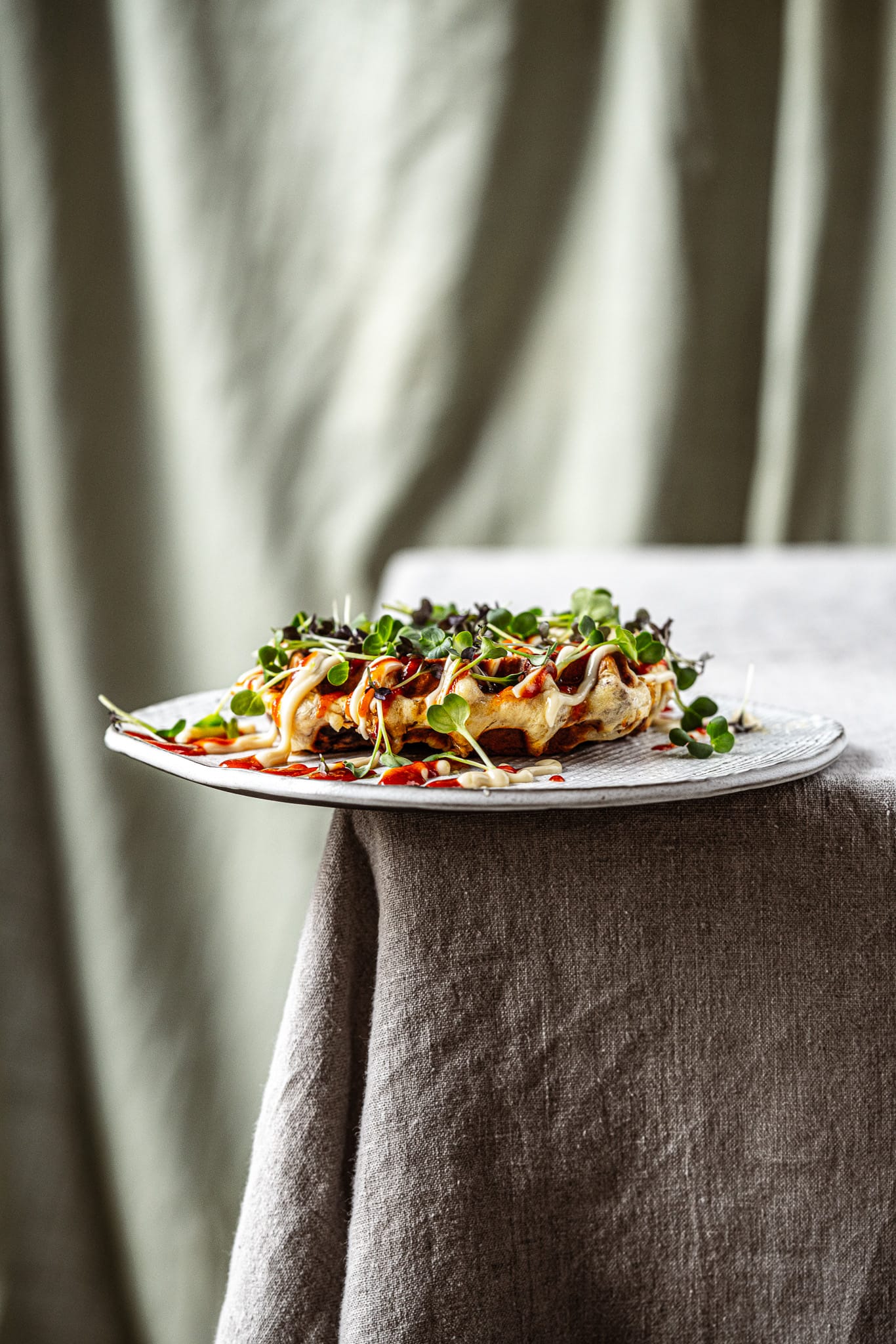 Richte die Waffeln auf Tellern an, beträufle sie mit Mayo, Sriracha und Honig. Garniere sie mit frischer Kresse bzw. Sprossen.