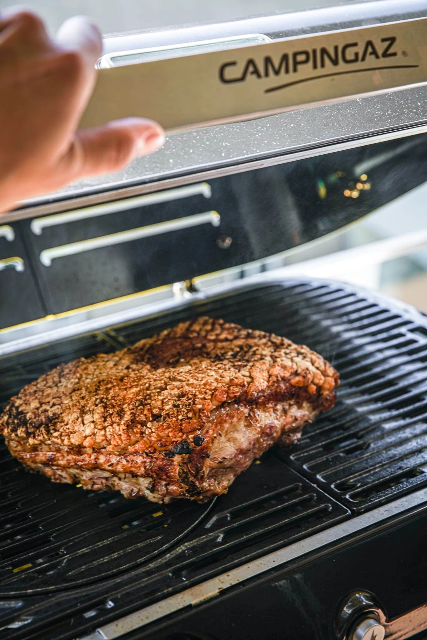 Nimm die Süßkartoffeln vom Grill, stell den Bräter mit dem Fleisch in die Mitte des Grills und dreh ihn voll auf.