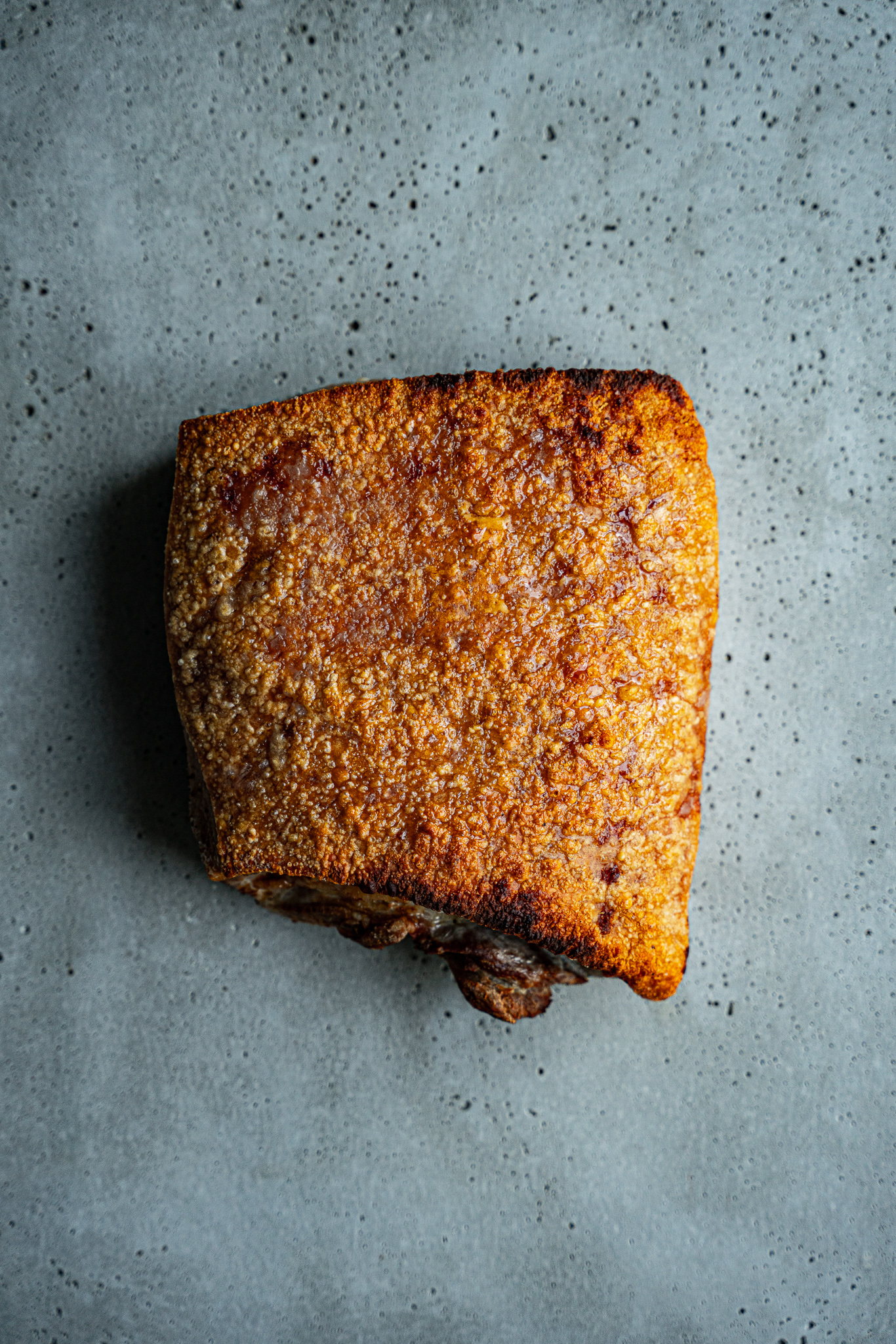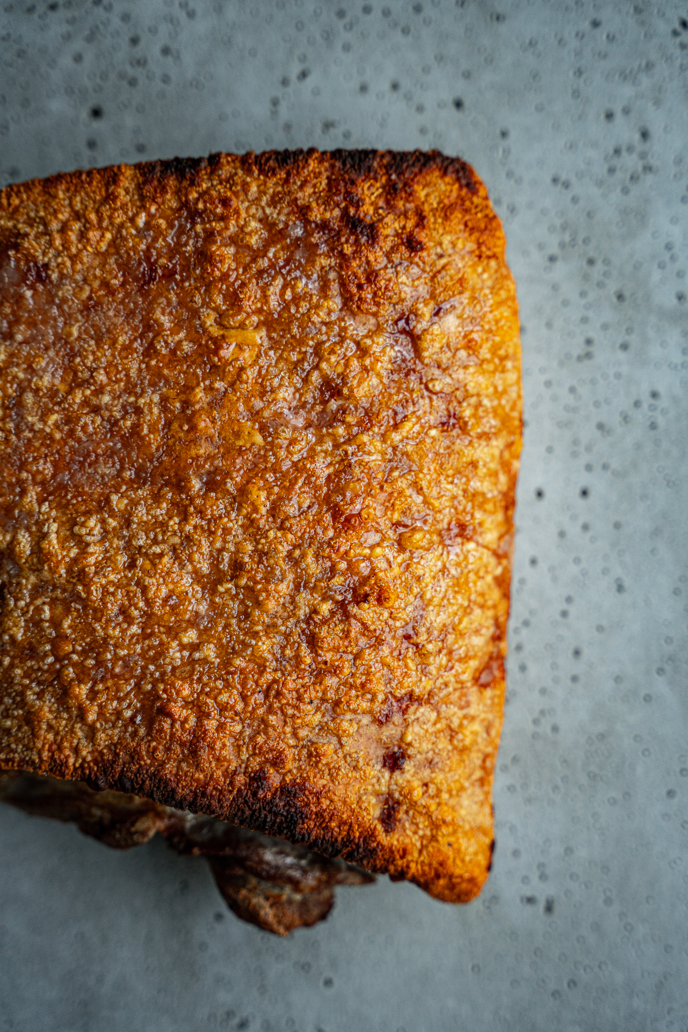 Bedecke die Schwarte ca. 5mm dick mit Salz und stell den Schweinebauch über Nacht in den Kühlschrank. 16 – 24 Stunden.
