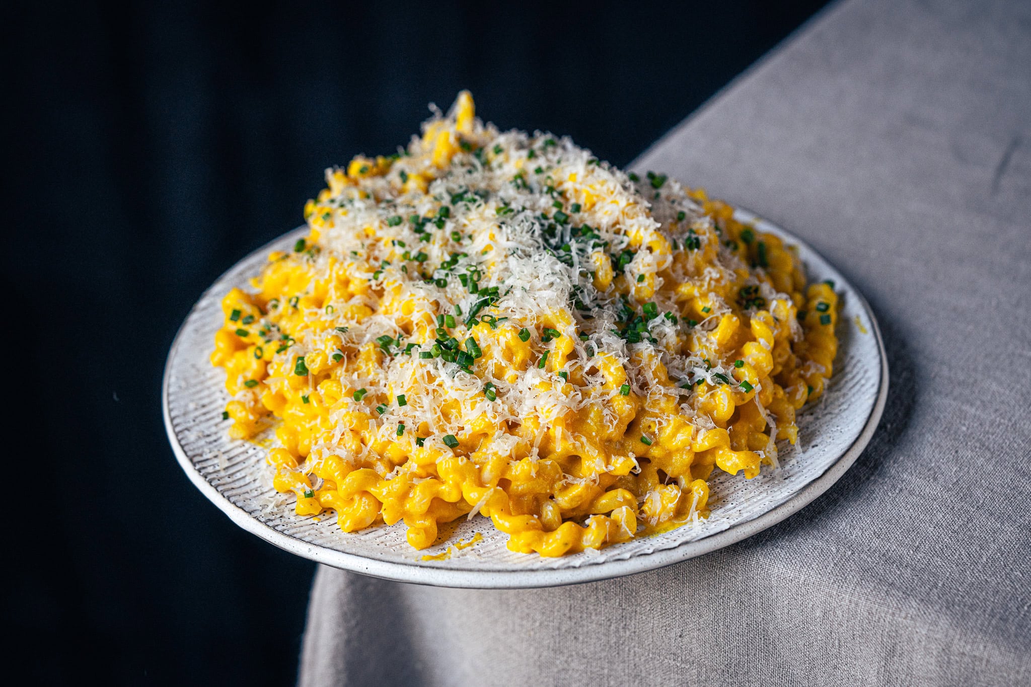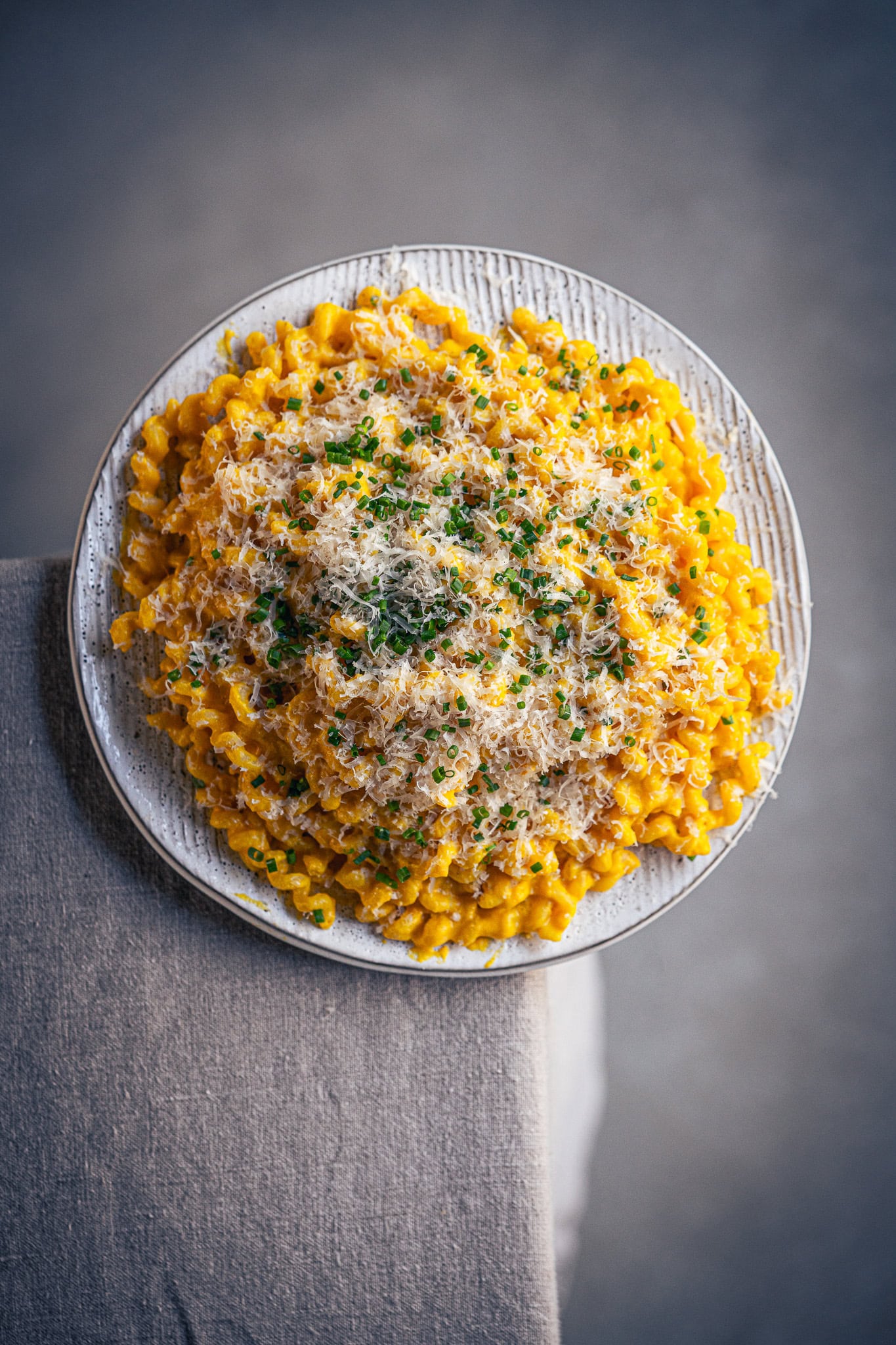 Auf einem Teller anrichten, mit Parmesan und Schnittlauch toppen. Moihzeit!
