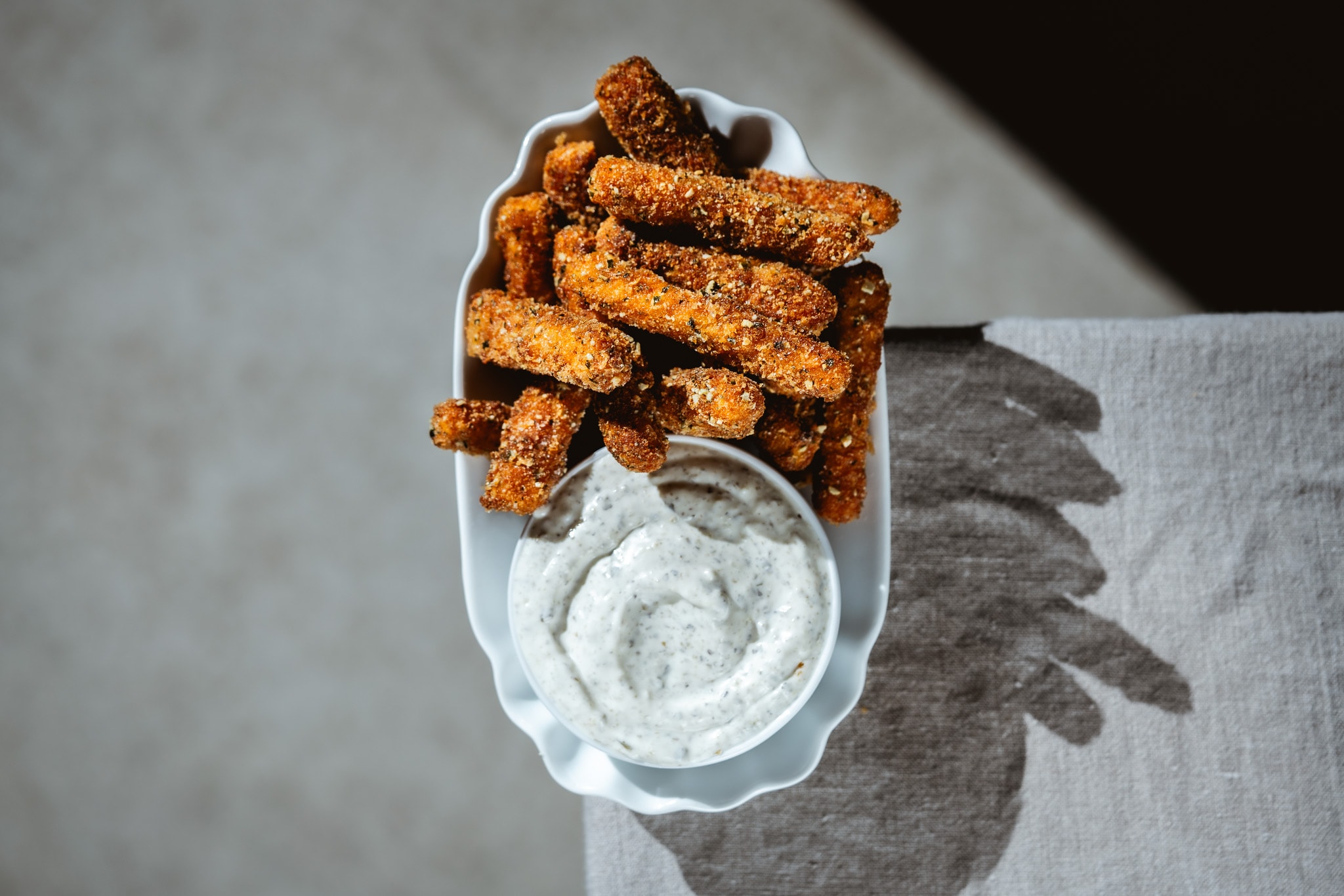 Die Kürbis-Fries mit dem Joghurt-Dip servieren und noch heiß genießen.