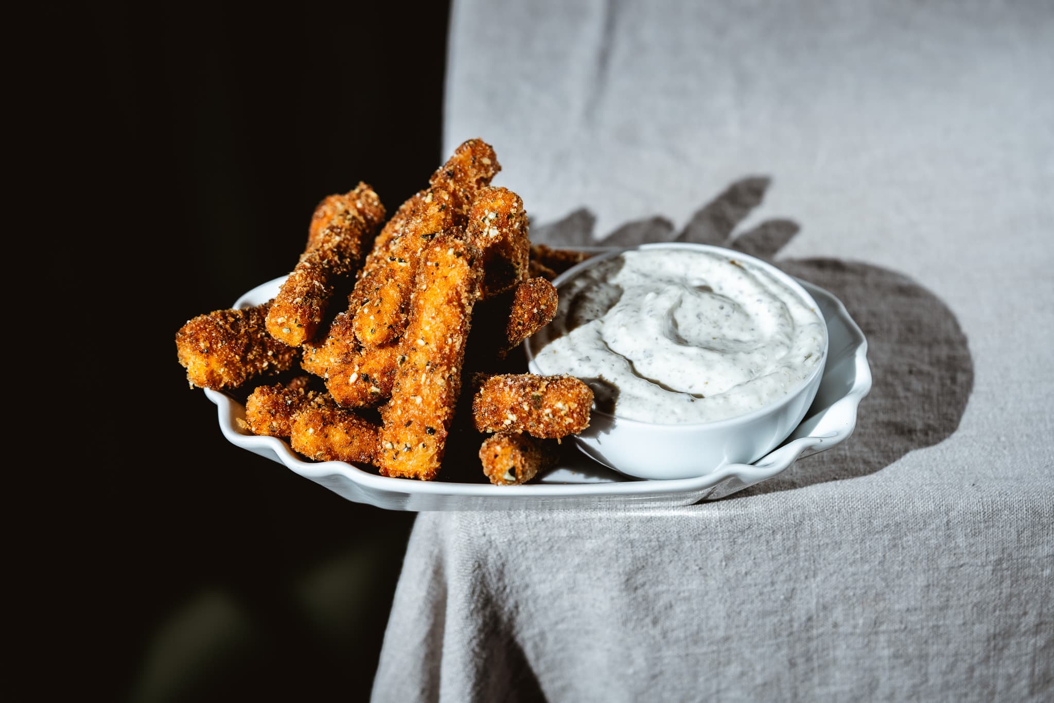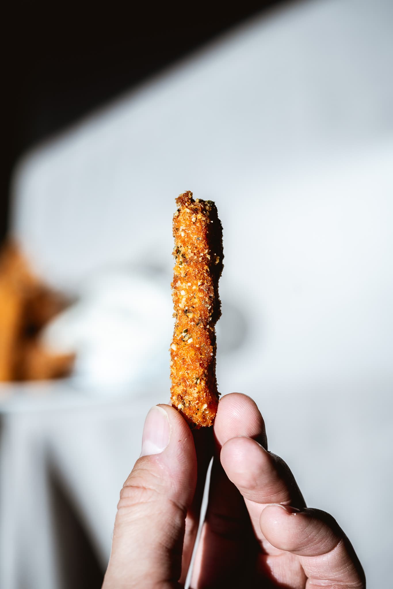 Die Kürbisstifte erst in Mehl, dann in verquirltem Ei und am Ende in der Panko-Parmesan-Kürbiskern-Mischung wälzen.