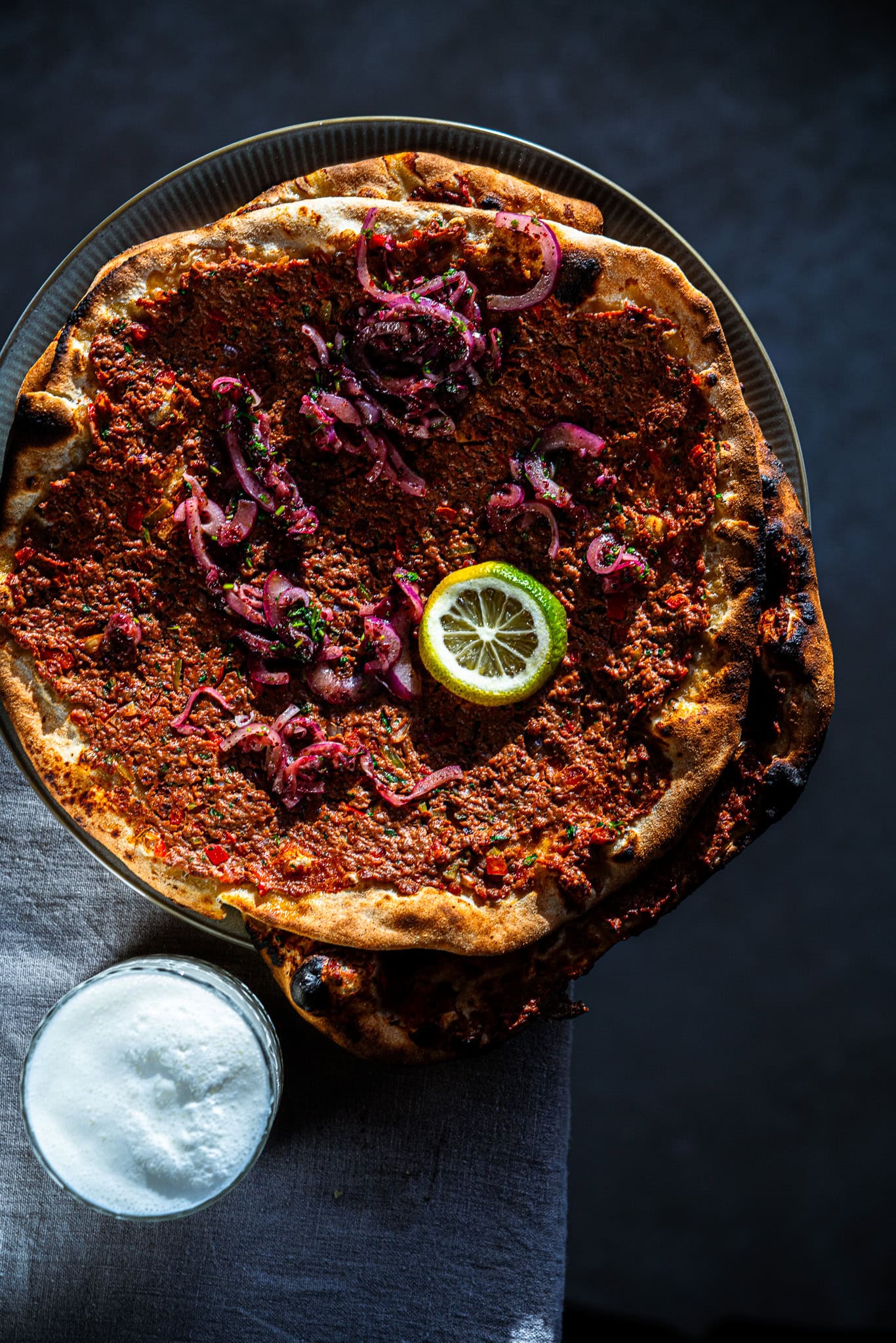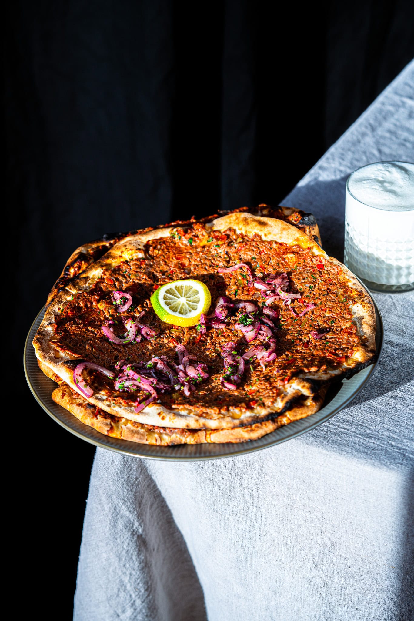 Lahmacun mit ordentlich Sumach-Zwiebeln toppen, mit Zitronensaft beträufeln und mit einem Glas Ayran servieren. Mahlzeit!