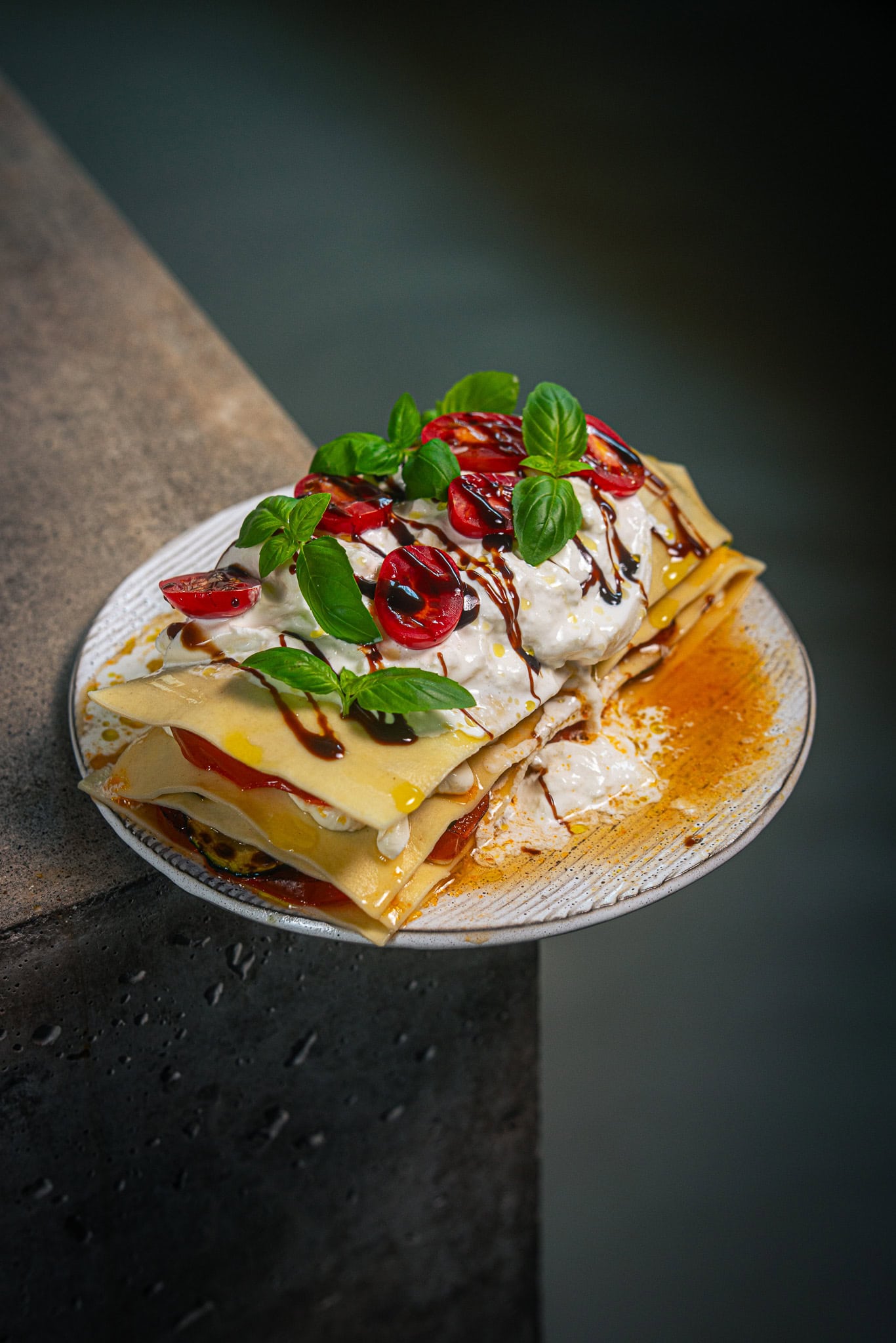 Bau die offene Sommer-Lasagne dann auf einem Teller zusammen. Das geht so: