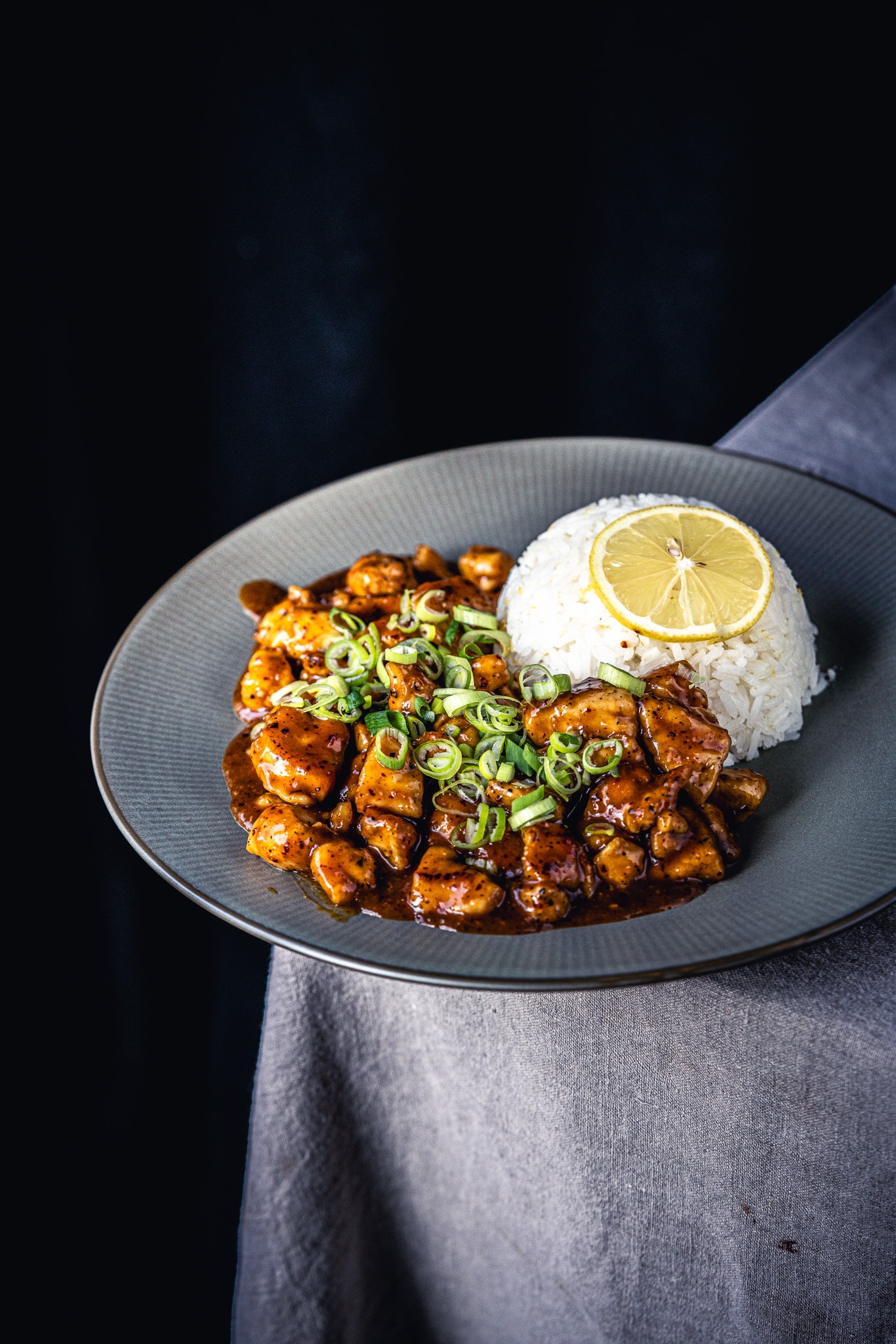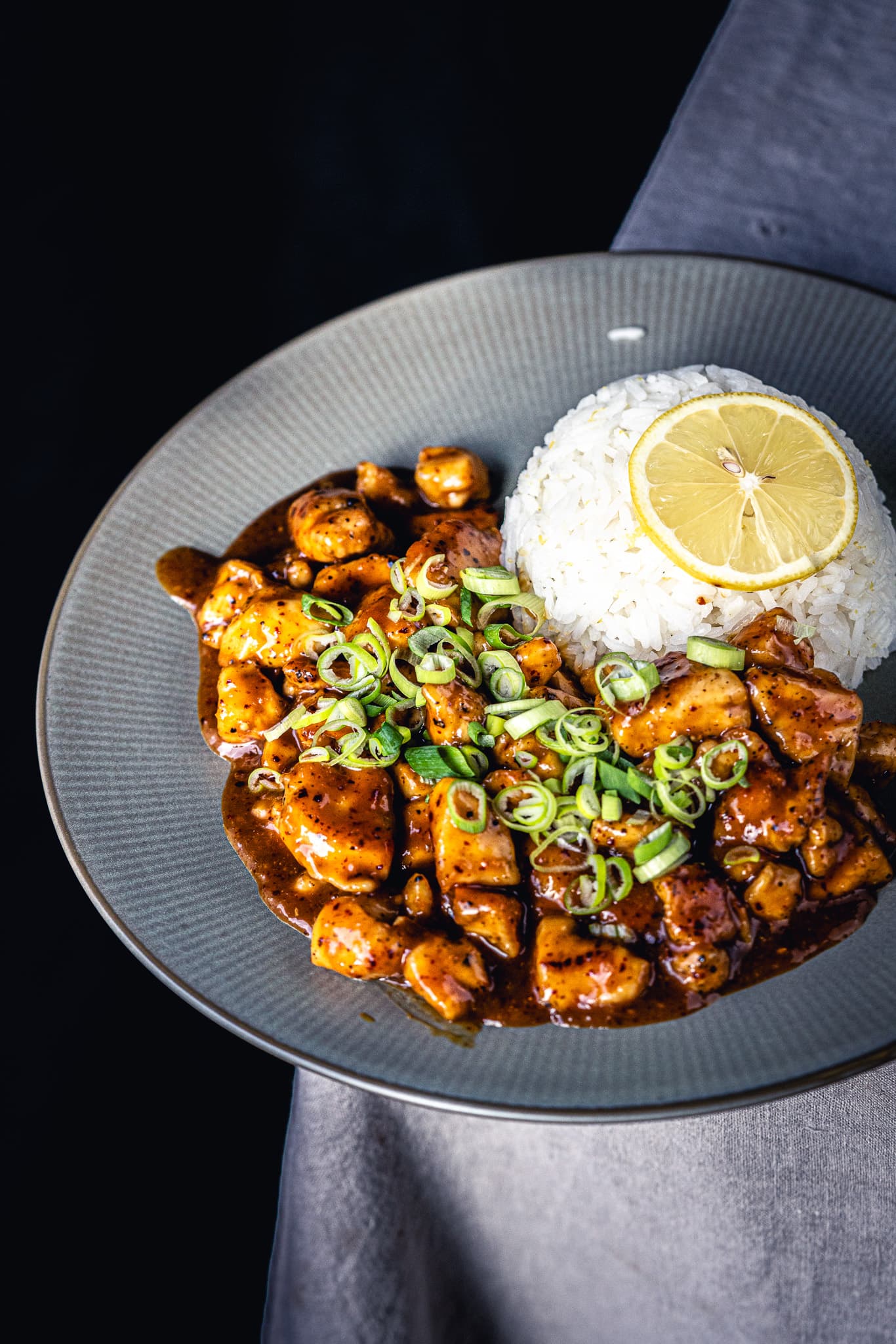Serviere dein Orange Chicken mit Zitronenreis und garniere es mit etwas Jungzwiebelgrün.