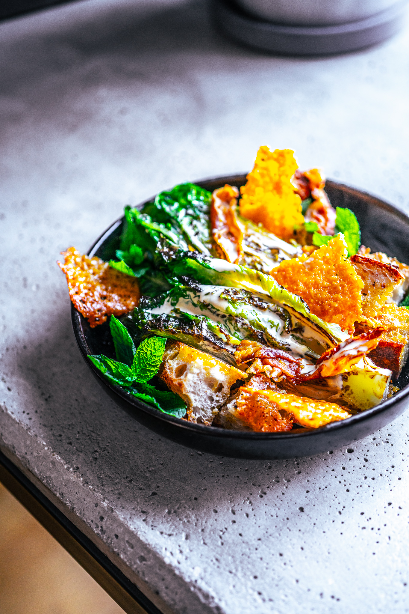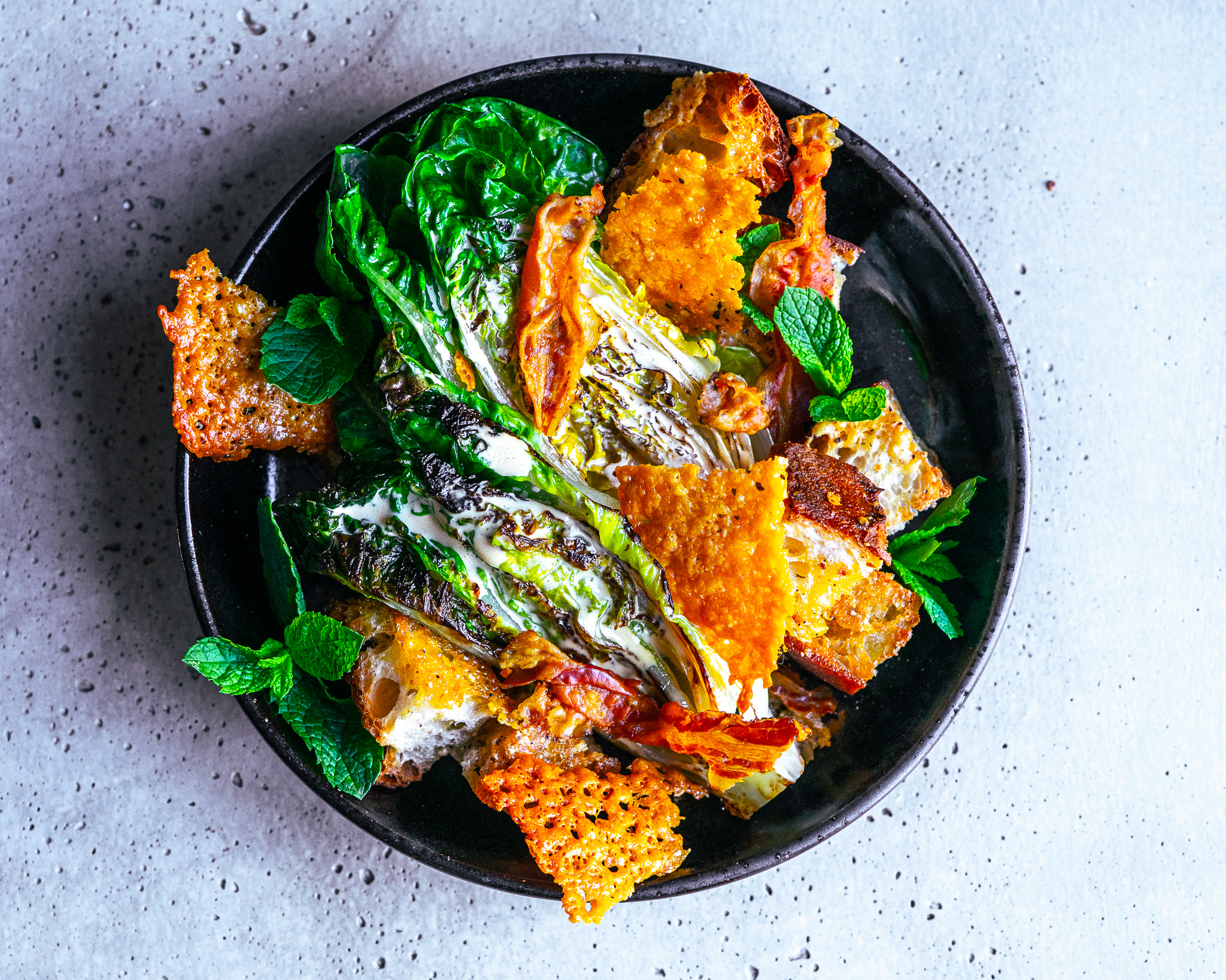 Für die perfekte Liaison dieser beiden sommerlichen Traumgerichte, verwende ich als Basis meine geliebten Salatherzen bzw. Romanasalat. Dieser wird einfach kurz aber sehr heiß geröstet. Dazu gesellt sich ein cremiges Caesar Dressing mit meinem ganz persönlichen Touch und dreierlei Crunch bestehend aus würziger Pancetta, Parmesan und Brot. Salat-Liebe zum Quadrat!