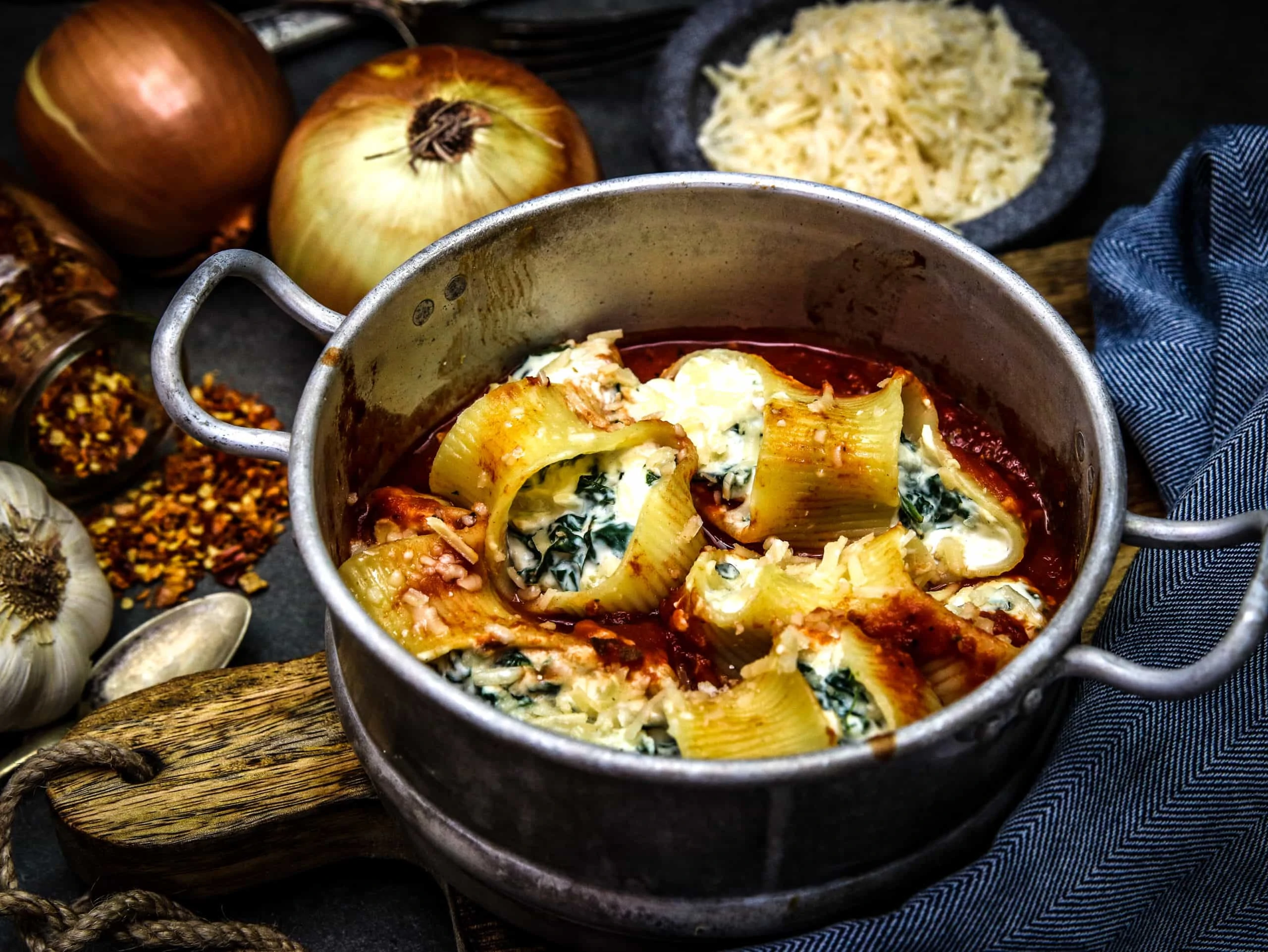 Die „Pastaschalen“ oder auch z.B. Lumaconi zuerst nach Packungsanleitung in Salzwasser bissfest kochen.