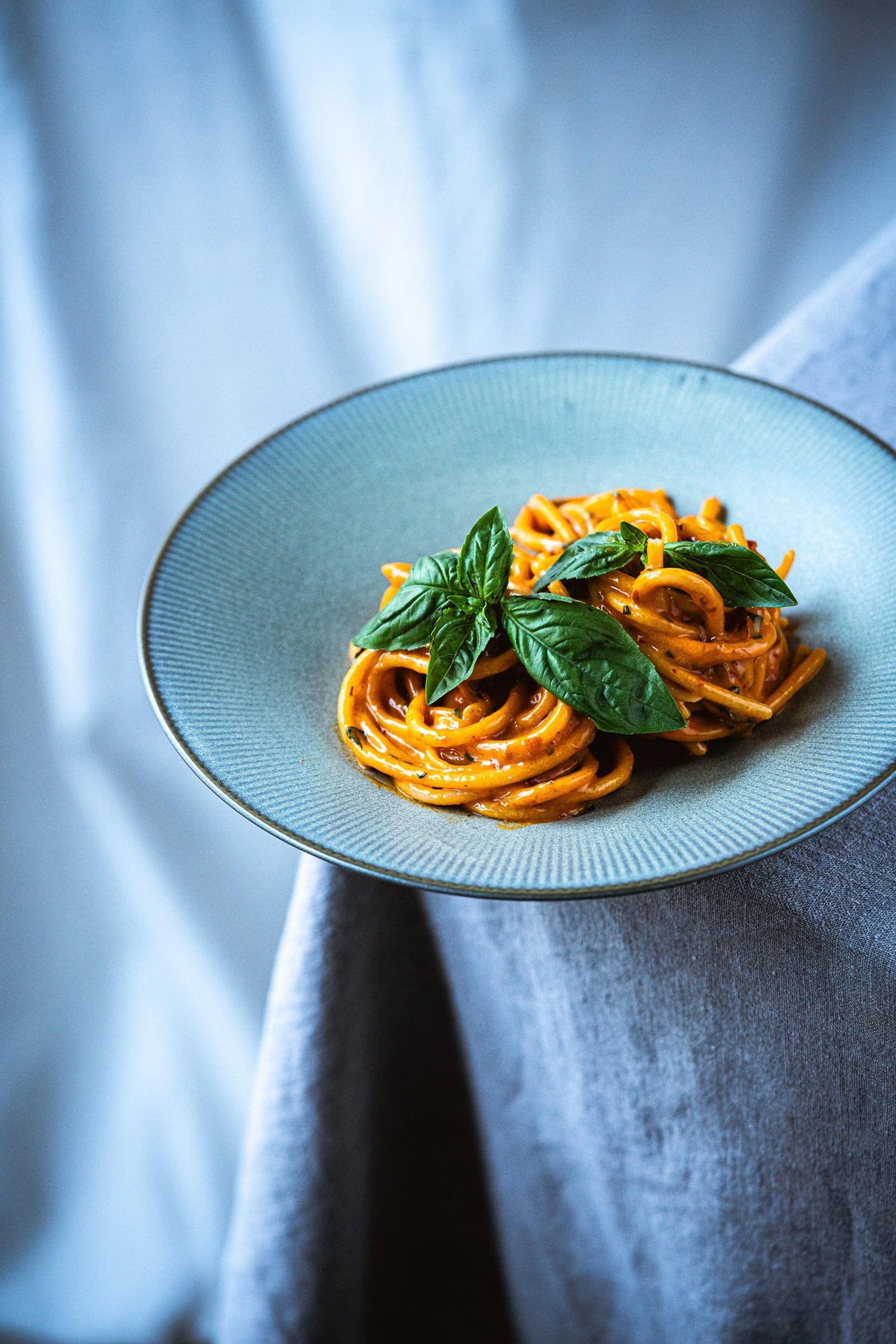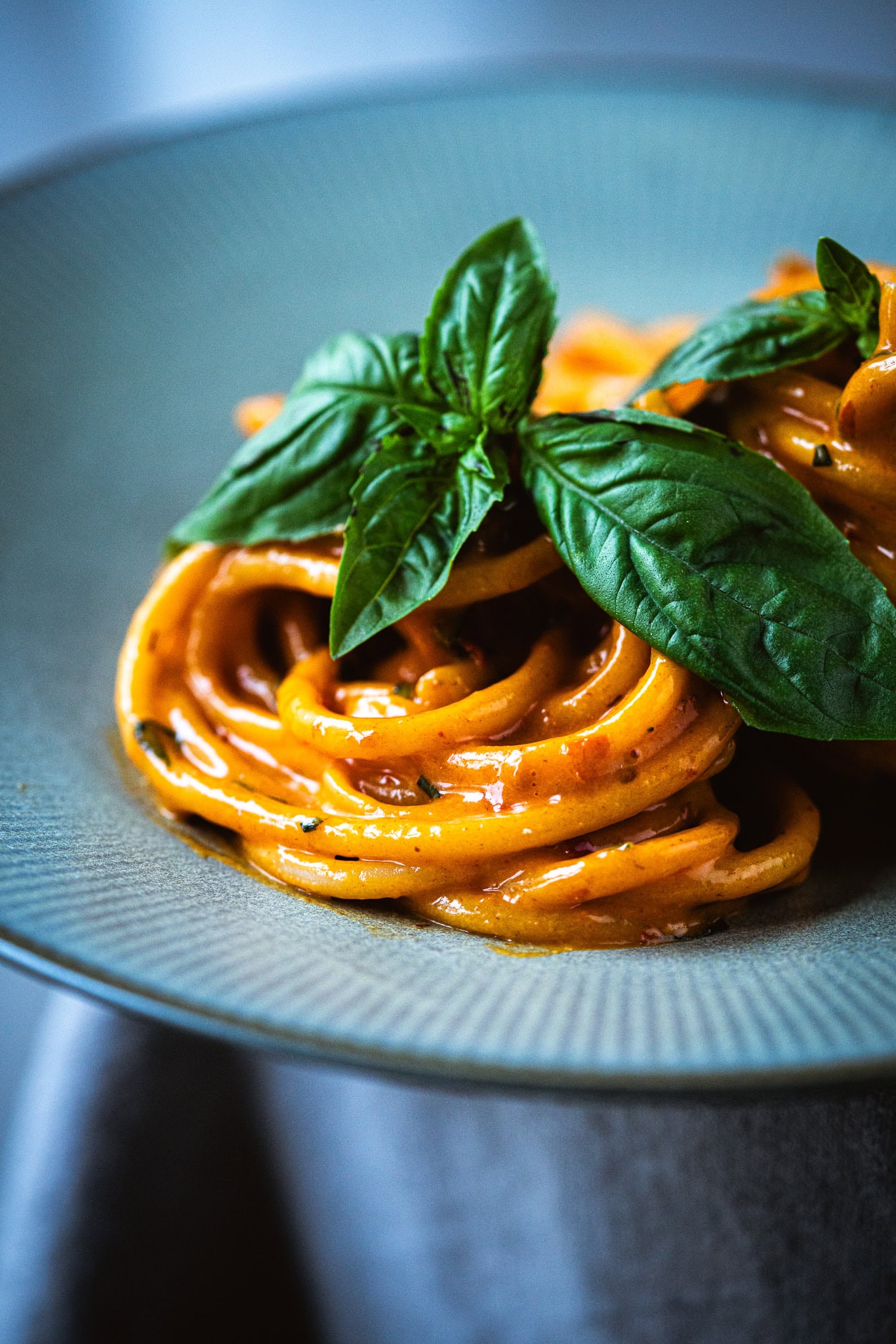 Richte deine Pasta auf einem Teller an und garniere sie mit etwas Basilikum.