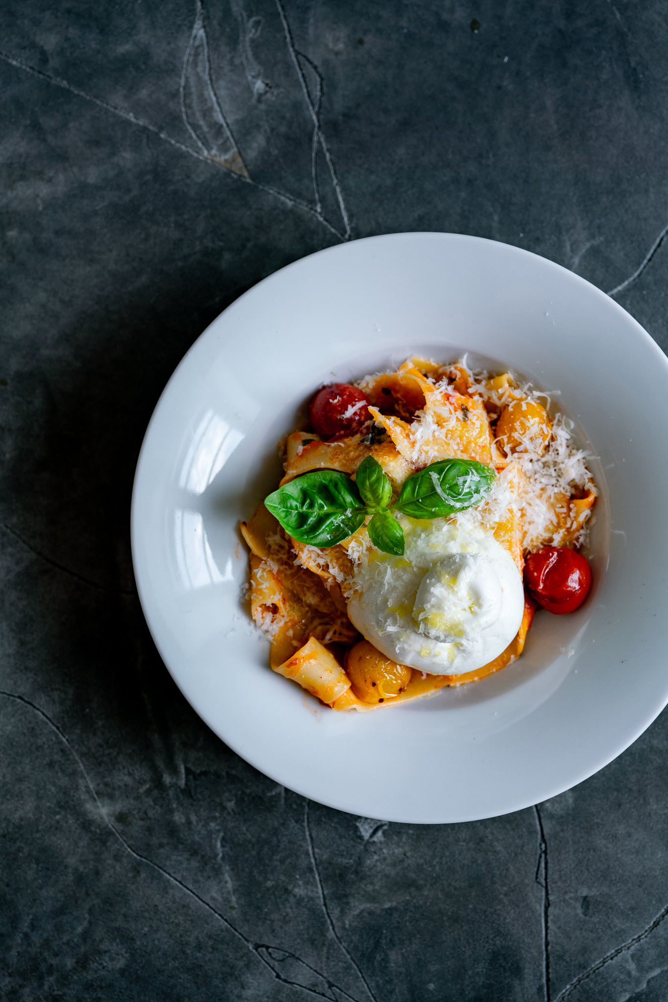 Die Penne Pomodoro nun auf zwei Tellern anrichten, mit den glasierten Paradeisern belegen, mit etwas Parmesan bestreuen und mit frischem Basilikum und Burrata servieren.