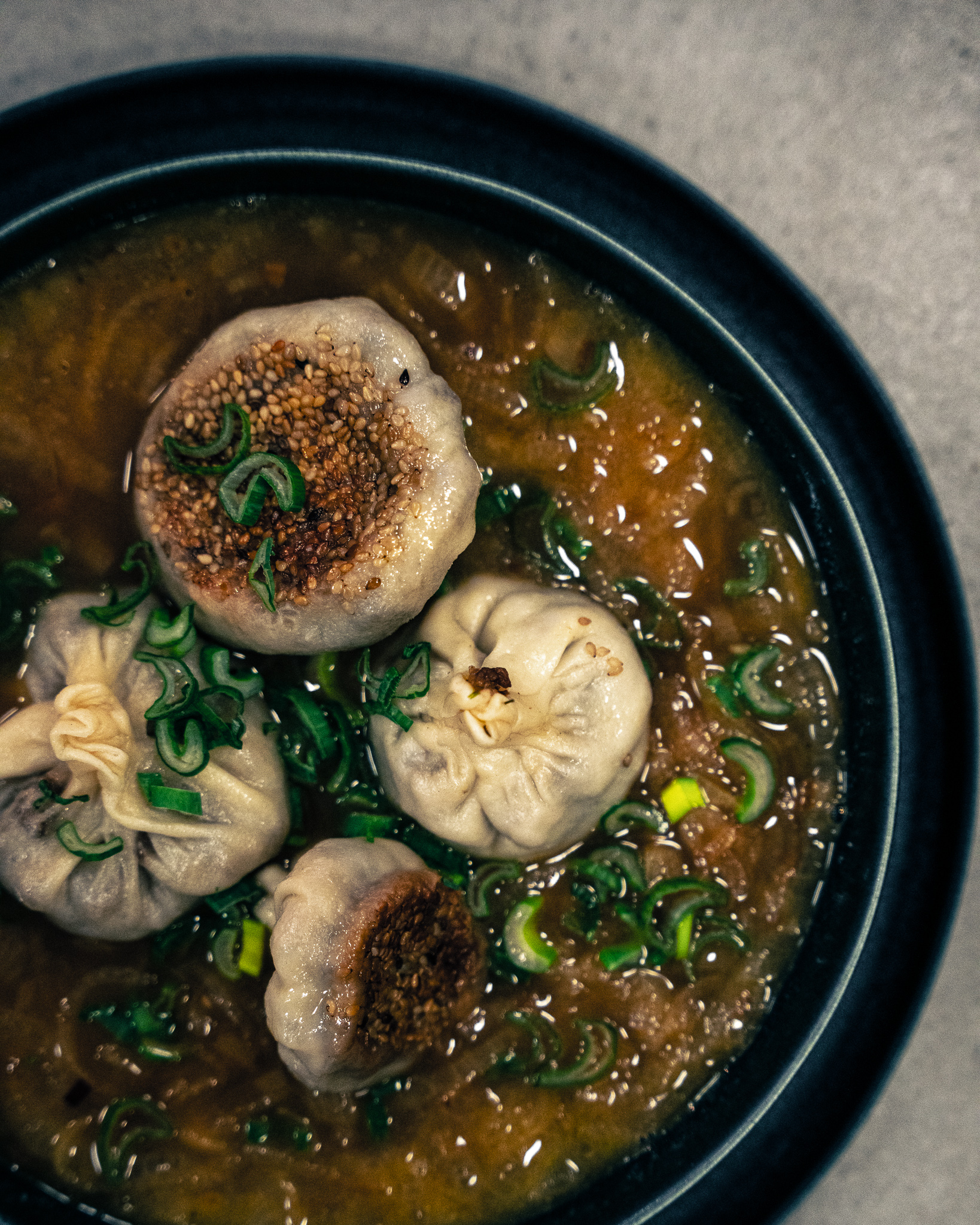 Die Dumplings nun in der Suppe servieren und final mit Jungzwiebelgrün garnieren.